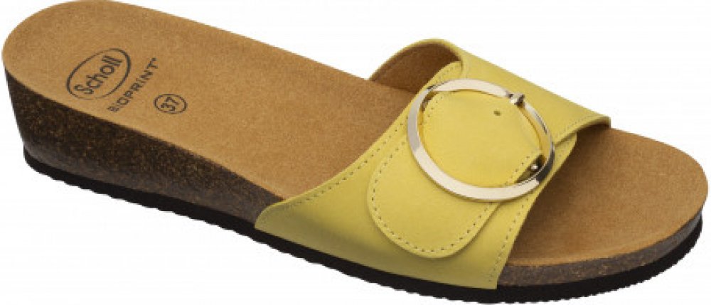 Dámské zdravotní pantofle Scholl Amalfi Mule ve žluté barvě se zdravotní stélkou Bioprint, která podporuje tvar nožní klenby, stabilizuje patu a přispívá ke zdraví Vašich nohou. Pantofle jsou vhodné na ven, jako doplněk letního outfitu. Módním prvkem je krásná a nepřehlédnutelná spona na nártu, která elegantně doplňuje vzhled obuvi. Nedělejte kompromis mezi moderní a zdravotní obuví, se značkou Scholl máte oboje.