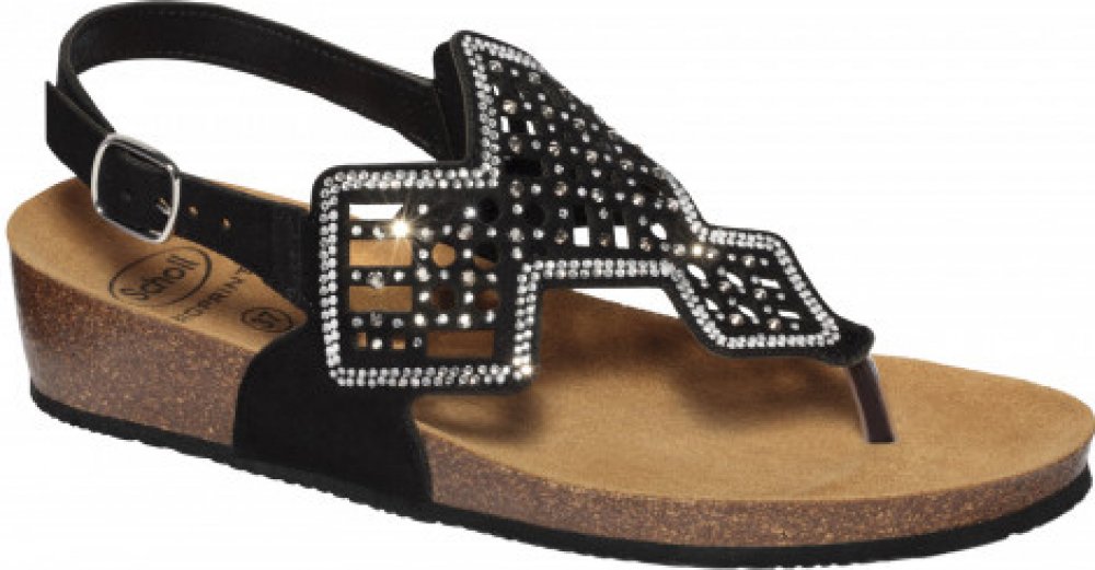 Scholl CAMILLA SANDAL černé dámské zdravotní sandále spojují ženskost a sofistikovaný šarm s unikátním designem, který zdobí černou obuv třpytivými kamínky uspořádanými do elegantního motivu arabesky. Klínový podpatek o výšce 4 cm dodává tomuto modelu štíhlý a elegantní vzhled, který ozvláštňuje váš outfit jako šperk. Boty Scholl Camilla jsou nejen stylovým doplňkem, ale také nabízejí vysokou úroveň pohodlí a podpory pro vaše nohy. Tato dámská obuv se vyznačuje flexibilitou, lehkostí a využívá technologii Scholl Bioprint®. Charakteristická stélka této technologie je vyrobena z přírodního korku a pryže, což umožňuje optimální udržení nohy ve správné poloze. Nové složení měkkého jádra stélky Scholl Bioprint® zvyšuje pohodlí chůze, poskytující vašim nohám optimální oporu během celého dne. Dámské pantofle Camilla nejen rozzáří váš outfit od rána do večera, ale také zdůrazní váš individuální styl a přinesou do vašeho každodenního života špičkový komfort a péči o zdraví nohou. Objednávejte pod kat. číslem F278251004