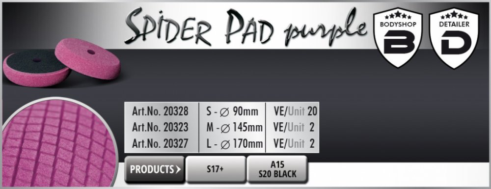 Scholl SpiderPad je nová generace leštících kotoučů, které v sobě kombinují výborné leštící schopnosti běžných pěnových kotoučů s chladícími vlastnostmi kotoučů z ovčí vlny. Jejich odolný povrch vede k většímu úběru laku a díky efektivnímu chlazení dojde k lepšímu využití stejného množství leštící pasty oproti běžným kotoučům.