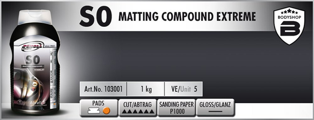 Extrémně silná matovací pasta známá též jako „tekutý brusný papír“. Hodí se pro přípravu (zmatnění) laku před lakováním a také pro odstranění výrazných nedokonalostí laku jako je silný přestřik, hluboké škrábance a rýhy a „pomeranče“ (orange peel).