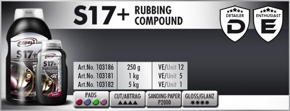 Leštící pasta Scholl Concepts S17+ Rubbing Compound (1 kg) Univerzální pasta SCHOLL CONCEPTS S17+ Rubbing Compound lze použít pro všechny druhy leštění na čerstvě nalakované povrchy i pro odstranění silně poškrábaných a zvětralých laků. Vynikající brusný výkon spolu s brilantním zrcadlovým leskem a minimální tvorbou prachu vás uchvátí. Díky jedinečné technologii iPT (inteligentní prášková technolo...