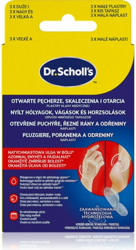 Scholl Dr. Scholl's Open Blisters, Cuts and Abrasions, 2x3 ks, Náplasti pro ženy, Nedovolte, aby se do pokožky s oděrkami či jiným drobným poraněním dostaly nečistoty. Náplasti Scholl Dr. Scholl's Open Blisters, Cuts and Abrasions slouží pro spolehlivé a hygienické ošetření poškozené kůže. Po přilepení dobře drží a přitom nechají vaši pokožku volně dýchat. Vlastnosti: chrání drobná poranění před nečistotami vytváří bariéru proti bakteriím jednotlivě balené dělené náplasti fungují na principu vlhkého hojení jednotlivě balené zmírňuje tlak puchýřů vyrobeno z pružného materiálu transparentní provedení pro snadnou kontrolu ran různé velikosti v balení