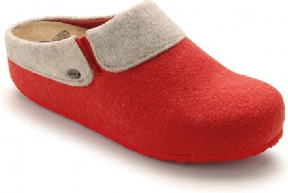Dámské pantofle Kapel od známé značky Scholl jsou ideální domácí obuví. Tyto pantofle červené barvy mají jednoduchý, ale přes to krásný design s béžovými prvky kolem paty a nártu. Obuv je vyrobená z plsti a je vybavena přírodní stélkou Bioprint vyrobené z pryže a korku. Tato stélka je anatomicky navržená tak, aby správně tvarovala vaše chodidla a pozitivně působila na chodidla, dolní část zad a také lýtka. Jejím dalším úkolem je snižovat napětí ve svalech v nohách, abyste si mohla v klidu užívat domácí prostředí bez nepříjemných bolestí a napětí. Objednávejte pod kat. číslem F252281262