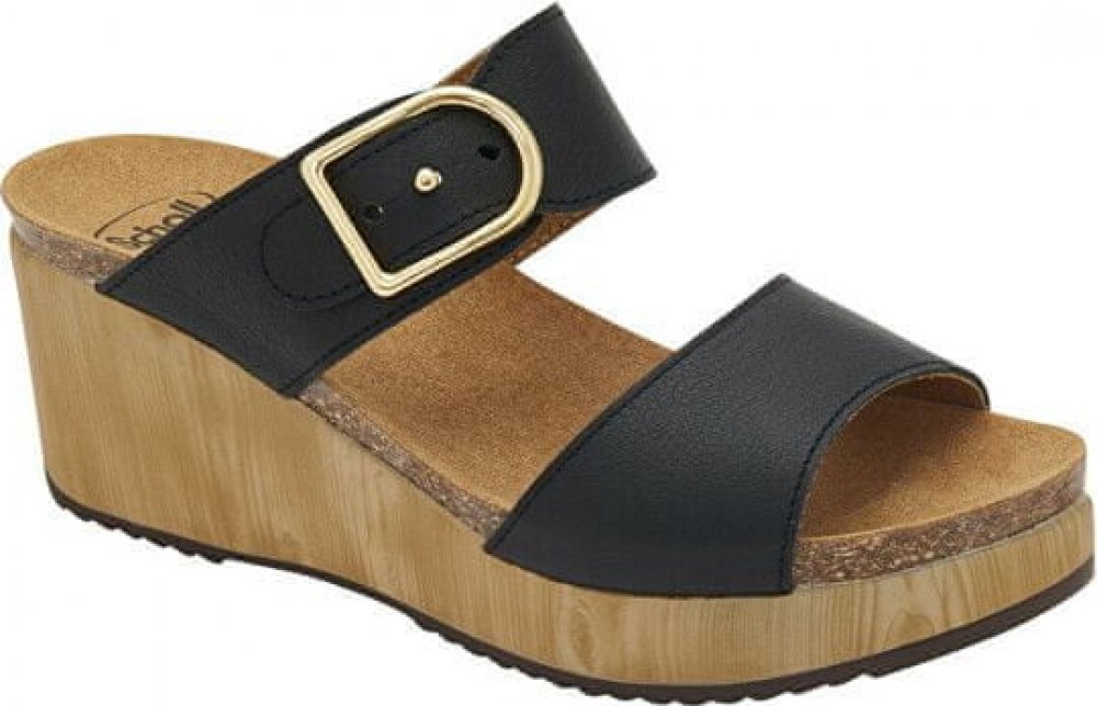 Scholl ORTONA - dámské zdravotní pantofle na klínku.Pantofle se širokými koženými pásky na klínku. Semišová stélka s technologií Bioprint pomáhá rozložit tlak na celé chodidlo. Scholl's Bioprint představuje novou úrověň pohodlí při chůzi. Vyznačuje se velmi přizpůsobivou stélkou s dokonale umístěnými, anatomicky navrženými flexibilními zónami. Má také pohodlnou výšku klenby a paty a stabilní konst...