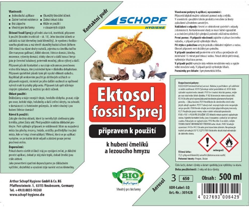 BIO křemenitý prášek ve spreji k hubení čmelíků i štěnic SCHOPF EKTOSOL FOSSIL SPRAY, 500ml