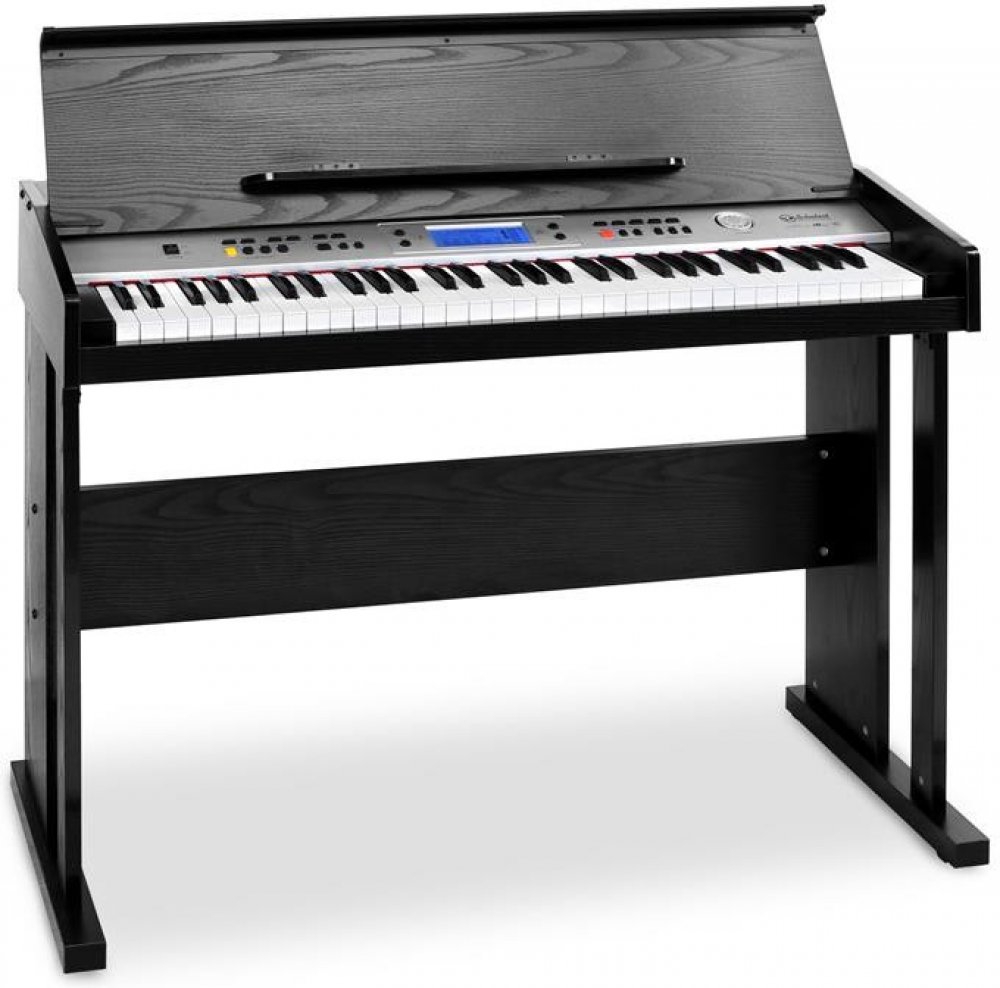 Schubert Carnegie-61 je plnohodnotný elektronický hudební nástroj určený pro všechny muzikanty se smyslem pro komponování, improvizaci a interpretaci.Tento keyboard je vybaven klaviaturou s 61 klávesami citlivými na intenzitu úderu, které umožňují dynamickou hru.Kromě toho jsou jeho součástí zvuky 136 hudebních nástrojů, 100 předprogramovaných rytmů s nastavitelnými přechody a 8 demo skladeb s možností vypnutí přehrávání melodie.Na výběr a nastavování těchto parametrů slouží jednoduché kolečko.Schubert Carnegie-61má navíc i funkci hudebního doprovodu (jeden palec / akordy) a dokáže klaviaturu rozdělit tak, aby hráč na její pravé straně využíval jiný nástroj než na levé.Integrovaná funkce nahrávání se aktivuje pomocí jednoho tlačítka, díky čemuž je nahrávání, zpracovávání nových melodií a zaznamenávání cvičení velmi intuitivní.Díky linkovému výstupu a integrovaným reproduktorům je zařízení použitelné i při přehrávání hudby z externích komponentů a na pořádání menších vystoupení nebo nahrávání.Studiovým muzikantům nabízí tento klavír i MIDI výstup, určený k vedení signálu do efektového zařízení nebo sampleru, a MIDI vstup pro připojení zvukového modulu.Digitální funkce přizpůsobená na učení umožní všem milovníkům hudby nabýt první muzikantské zkušenosti.Na zadní straně zařízení se nachází sluchátkový výstup pro připojení sluchátek, které uživatelé a jejich okolí ocení zejména při nočním cvičení.Kromě toho je zařízení vybaveno velmi praktickým stojanem na noty.Montáž a instalace tohoto keyboardu je díky názornému manuálu velmi jednoduchá a zabere – v závislosti na technických dovednostech – několik minut.V případě, že se zařízení nepoužívá, je klaviaturu a ovládací panel možné zakrýt dřevěným krytem, který ho ochrání před prachem.Černá dřevěná konstrukce díky své jednoduchosti bez problémů zapadne do každého pokoje či zkušebny.Upozornění:Keyboard je dodáván v jednom balení o hmotnosti 26 kilogramů.Prosíme, všimněte si, že je dodáván nesestavený.Na jeho složení jsou potřeba dvě osoby.