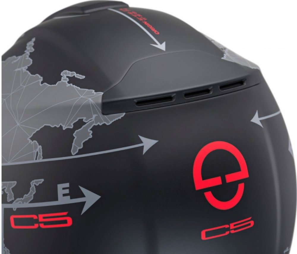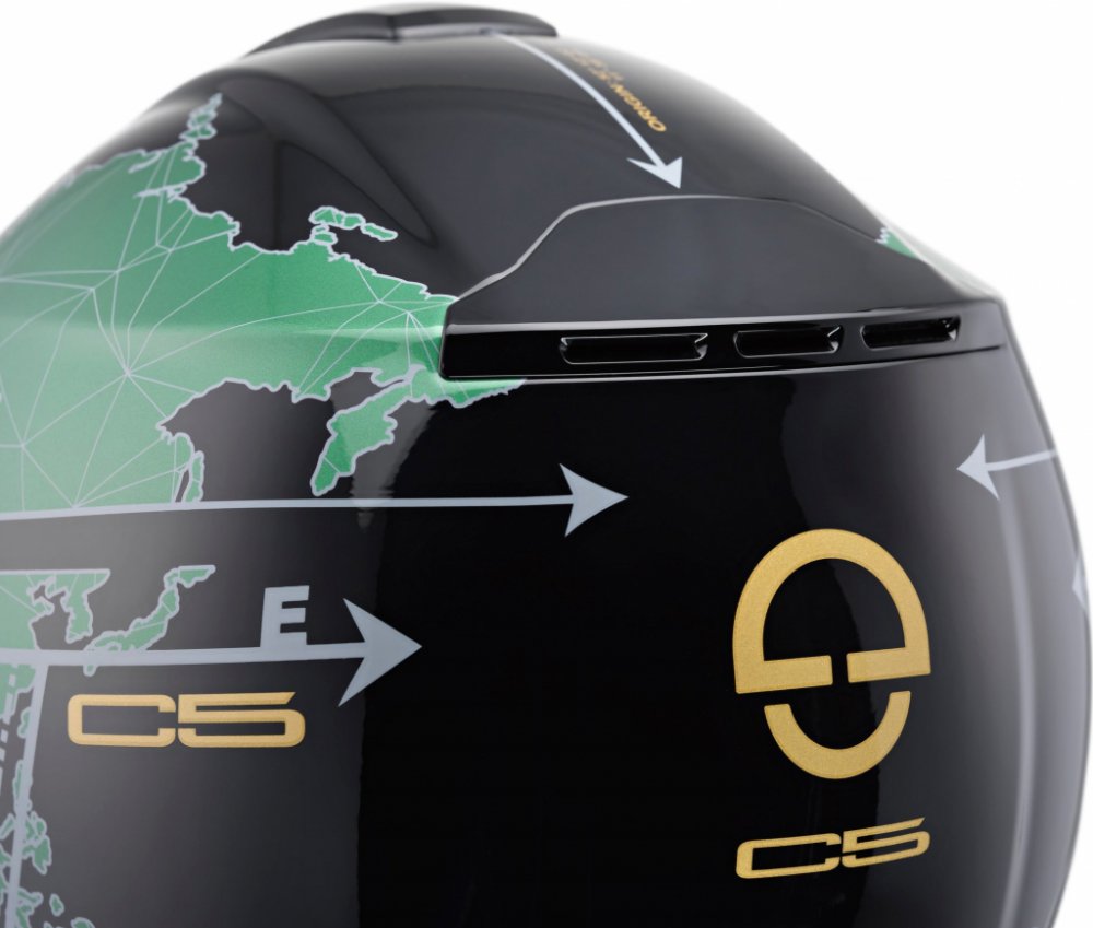 SCHUBERTH C5 má nově dvojitou ventilaci na bradě, jejíž součástí je vyjímatelný a pratelný filtr, který zabraňuje vniknutí pevných částic a hmyzu. Přizpůsobení přítoku vzduchu podle potřeby je opravdu snadné i v rukavicích. Systém doplňuje ještě třetí větrání, nový spoiler v zadní části přilby s odvodem vzduchu a odkrytými kanálky v EPS skořepině, který chladí temeno hlavy.