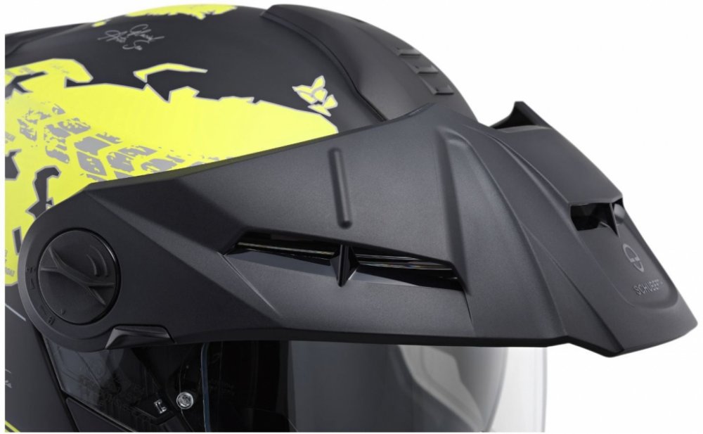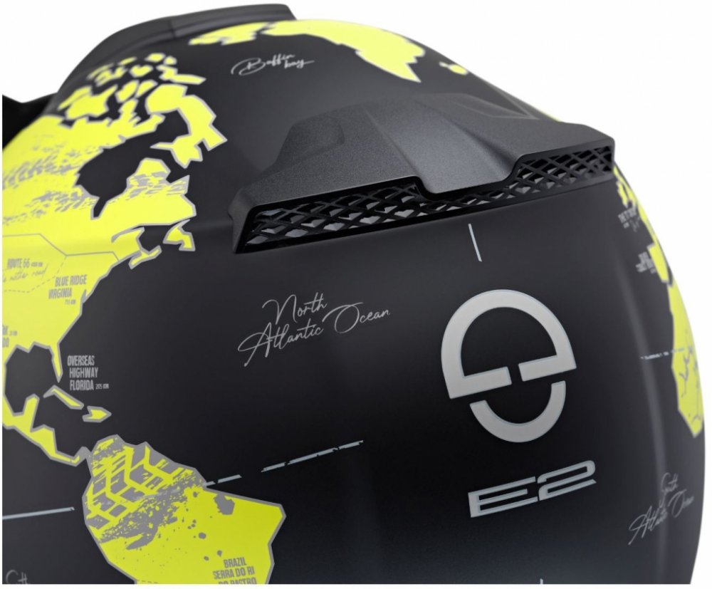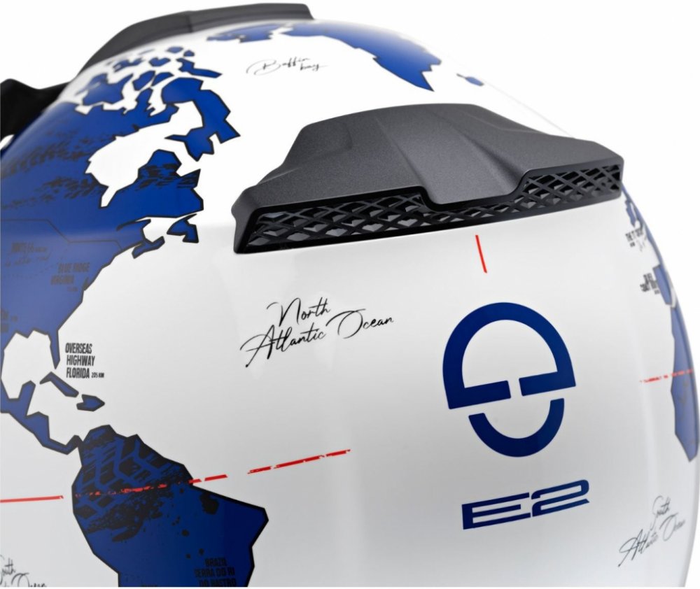 Nový kšilt byl pro E2 vyvinut ve větrném tunelu, aby se minimalizoval vznik vibrací. Dá se nastavit do tří poloh ale i velmi snadno sundat. Navíc má paměť, takže zůstává stále ve stejné poloze, i když vyklopíte bradovou část.