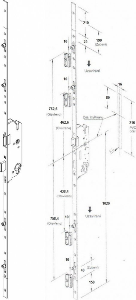 - Rozměr od středu otvoru pro čtyřhran kliky ve směru dolu na střed rolen 438,4 a 758,4 mm