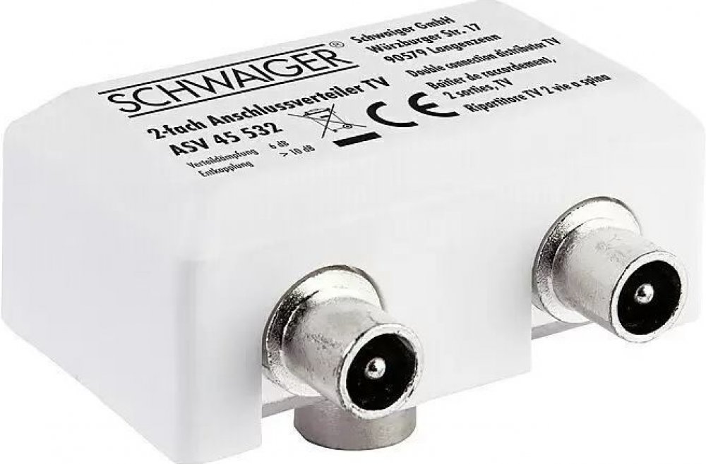 Tento připojovací rozdělovač SCHWAIGER se jednoduše zasune do TV přípojky anténní zásuvky a umožňuje tak provoz druhého televizoru. Připojovací rozdělovač je vyroben z masivního kovu s plastovým pouzdrem pro vysokou aktivní i pasivní odolnost proti rušení. Technické parametry: - Technologie: širokopásmový kabelový systém - Rozvod: 2-cestný - Materiály: kov, plast - Připojení (vstup): 1x zásuvka IEC - Připojení (výstup): 2x zástrčka IEC - Frekvenční rozsah: 5-1000 MHz - Útlum rozvodu: 6 dB - Barva: Bílá Rozměry (Š x H x V): 60 x 37 x 36 mm