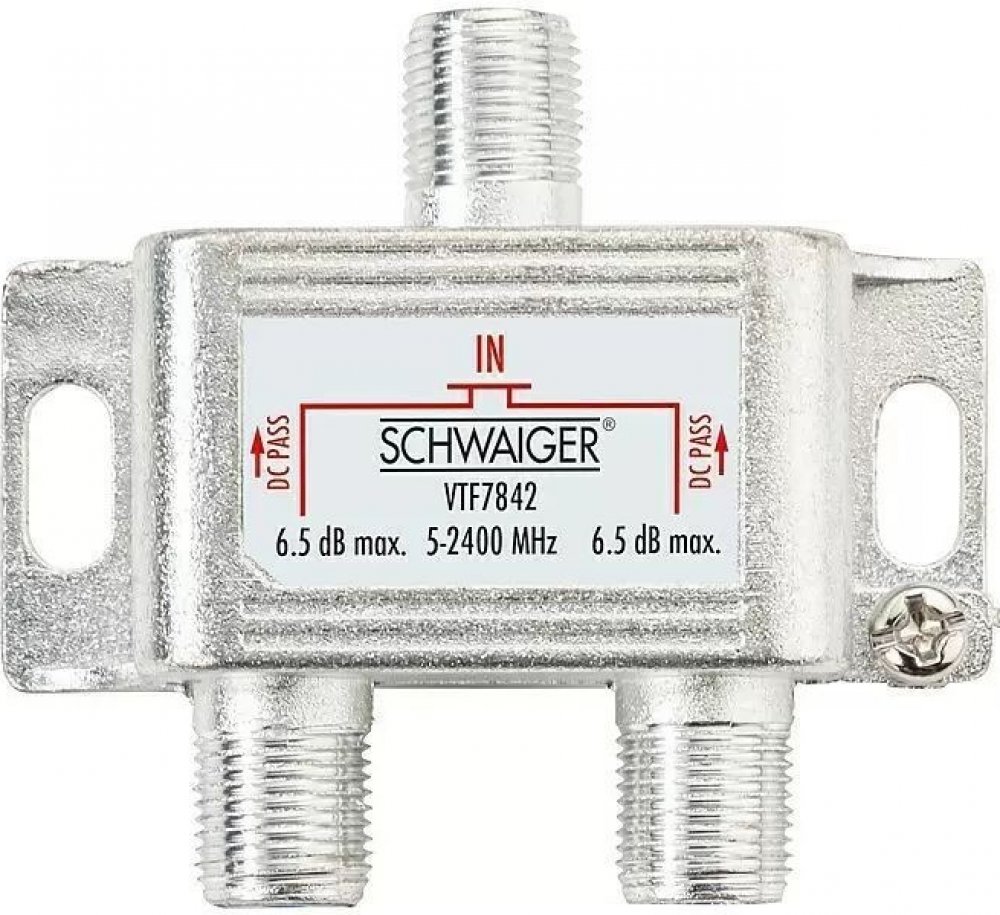 2násobný rozbočovač značky Schwaiger je vybaven třemi zdířkami F: jeden vstup a dva výstupy. Tak lze k jednomu kabelovému, satelitnímu nebo anténnímu zařízení paralelně připojit dva přijímače. Rozbočovač s průchodem stejnosměrného proudu se hodí pro frekvenční rozsah do 2 250 MHz. Je vyroben z hliníku odolného vůči korozi, a proto je lehký a kompaktní. Má výšku 58 mm, šířku 54 mm a hloubku 26 mm.