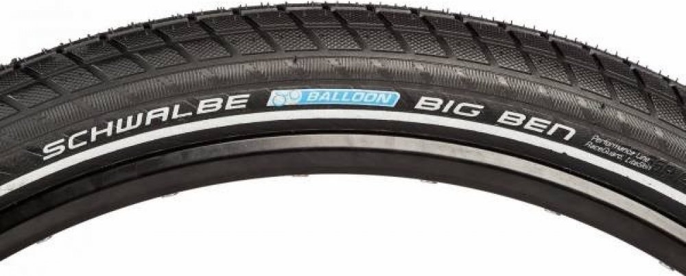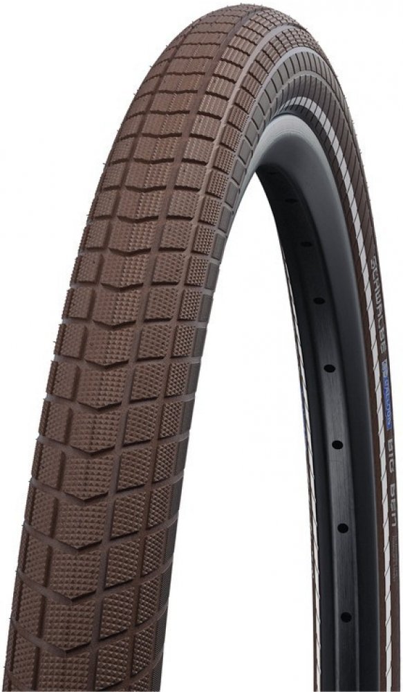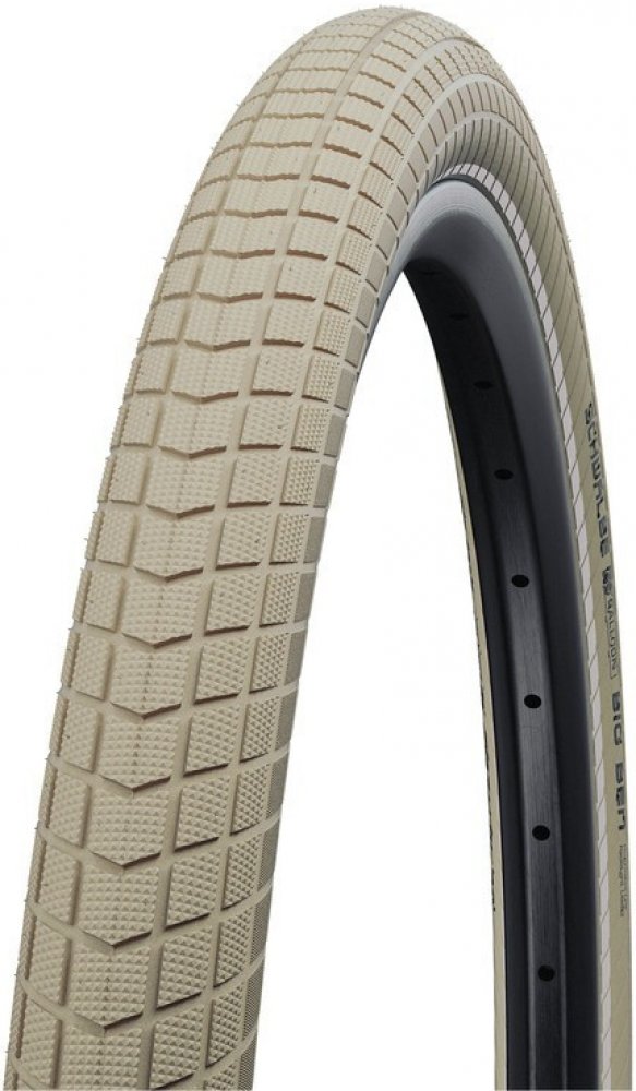 Plášť Schwalbe Big Ben 50-622 KevlarGuard, hnědá + reflexní pruh, drátový plášť Big Apple dostává bratra. Komfort je stejný, ale profil je viditelně jadrnější. Profil se nám tak líbil, že jsme ho použili i pro "normální" velikosti. Protože 40mm šířka pláště není "Big" jmenuje se Little Big Ben. Linie kvality Active line - spolehlivá kvalita s velmi hodnotnou kostrou 50 EPI. Ochrana 3 KevlarGuard - ochranný pás z přírodního kaučuku vyztužený kevlarovými vlákny. REFLEX - reflexní pruh. Rozsvítí se při nasvícení reflektorem. Se svítícími kruhy ve velikosti kola budete v bezpečí i v nejtmavější noci. Parametry: Barevné provedení: Hnědá+reflexní pruh Povedení: Active EPI: 50 Min./max. tlak: 2,5-5,0 bar Techn. ochrana: KevlarGuard Rozměr pláště: 28x2,0 ETRTO 50-622 Směs: SBC Maximální zatížení při maximálním tlaku: 115 kg Váha (cca váha, možná odchylka +/- 8%): 890 g Duše: 19, 19A Rozměr: 28"