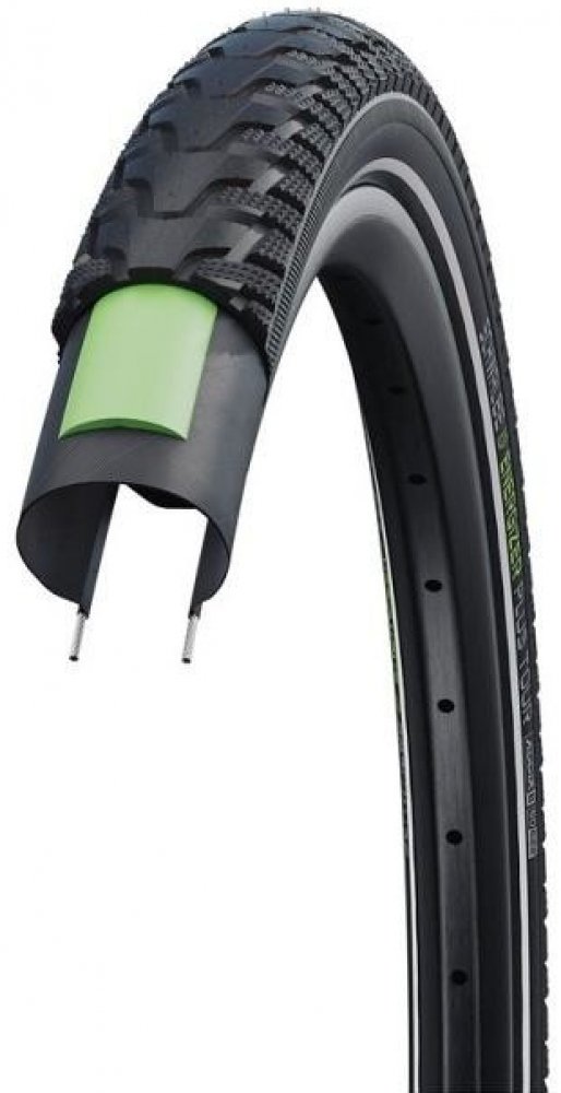 Pokud baterie vydrží. Nekonečné potěšení z jízdy s e-touringovým specialistou Energizer Plus Tour. S 3mm GreenGuardem na stejné úrovni bezpečnosti jako Energizer Plus, ale se silnějším přepracovaným trekingovým profilem, který se dříve osvědčil na našem Marathonu GT Tour jako ideální společník pro e-výlety na zpevněných cyklostezkách, ale i mimo ně. Samozřejmě s vysoce kvalitní konstrukcí (kostra 67 EPI), specializovanou směsí Energizer a certifikací ECE-R75 pro e-kola všech tříd. Reflex Reflexní pruh se rozsvítí při nasvícení reflektorem. Linie kvality Performance line Excelentní kvalita pro intenzivní nasazení. E.bike ready 50 km/h Doporučeno a homologováno pro elektrokola do 50 km/h Ochrana 5 GreenGuard GreenGuard.Stejný pricip účinnosti jako u SmartGuard ale ne tak silný.Vysoce elastický kaučuk je z třetiny vyroben z recyklovaných latexových produktů.