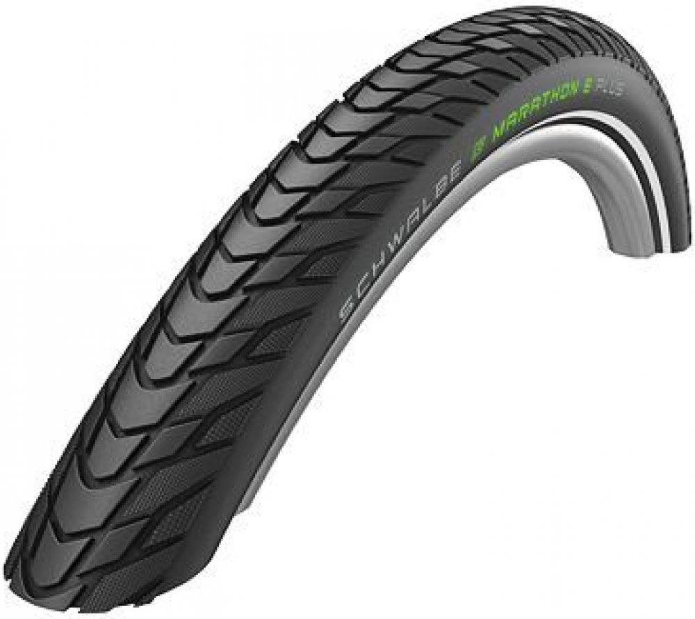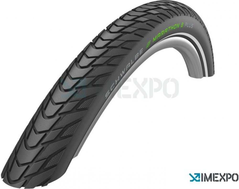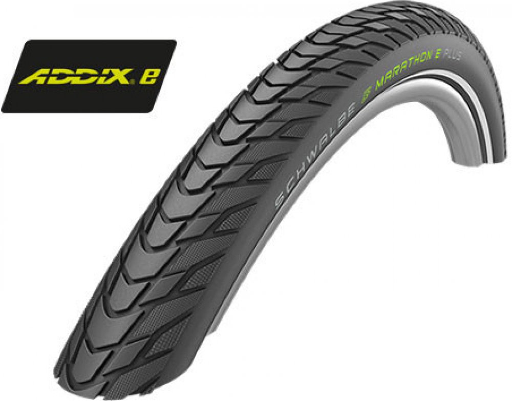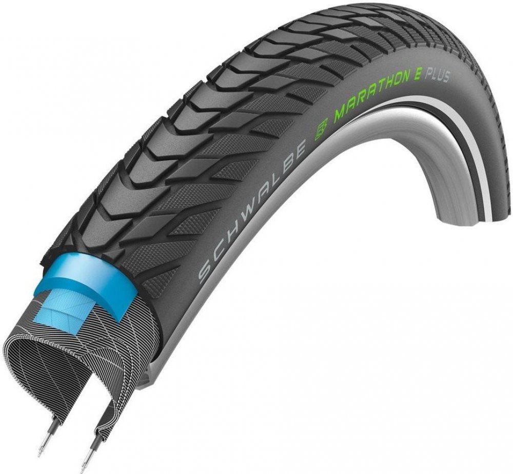 Neprorazitelný speciálně pro e-kola . Maximální bezpečnost jízdy při vysokých rychlostech a na dlouhých cestách. Nejvyšší kvalita maratonu, vyvinutá pro speciální nároky kladené na plášť pro e-bike. Bezpečnost: Stupeň ochrany proti defektu Schwalbe 7. Patentovaná vložka SmartGuard je navíc podporována dvěma vrstvami tkaniny RaceGuard. Tento „Smart-DualGuard“ chrání ještě lépe proti ostrým vetřelcům. Řízen í: Směs ADDIX-E, určená speciálně pro e-kola pro vynikající přilnavost i při vysokých rychlostech a maximální trvanlivost. Potěšení z jízdy: Marathon E-Plus se díky použití špičkového materiálu neuvěřitelně snadno odvaluje. Boční stěna „anti-aging“ vydrží typické přetížení v důsledku nízkého tlaku vzduchu mnohem déle, než dojde k ošklivým trhlinám. Nová konstrukce kostry zpevňuje boční stěny jinou vrstvou tkaniny, čímž stabilizuje pneumatiku pro ještě větší nosnost. Provedení: design profilu E-Plus je moderní a dynamický. S větší hloubkou profilu běhounu, extrémně univerzální pro turistiku a trekking. E-bike : Nový Marathon E-Plus je samozřejmě ECE-R75 certifikován a je také připraven pro e-kola s asistencí do 25 km / h, stejně jako S-pedelecs. Dostupné velikosti jsou důsledně orientovány na požadavky nejmodernějších e-kol.
