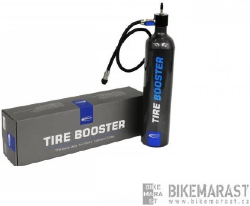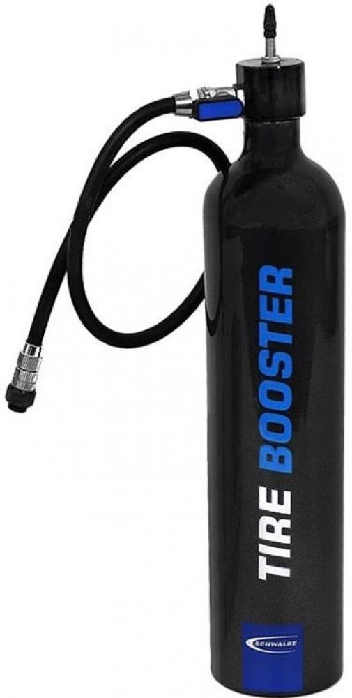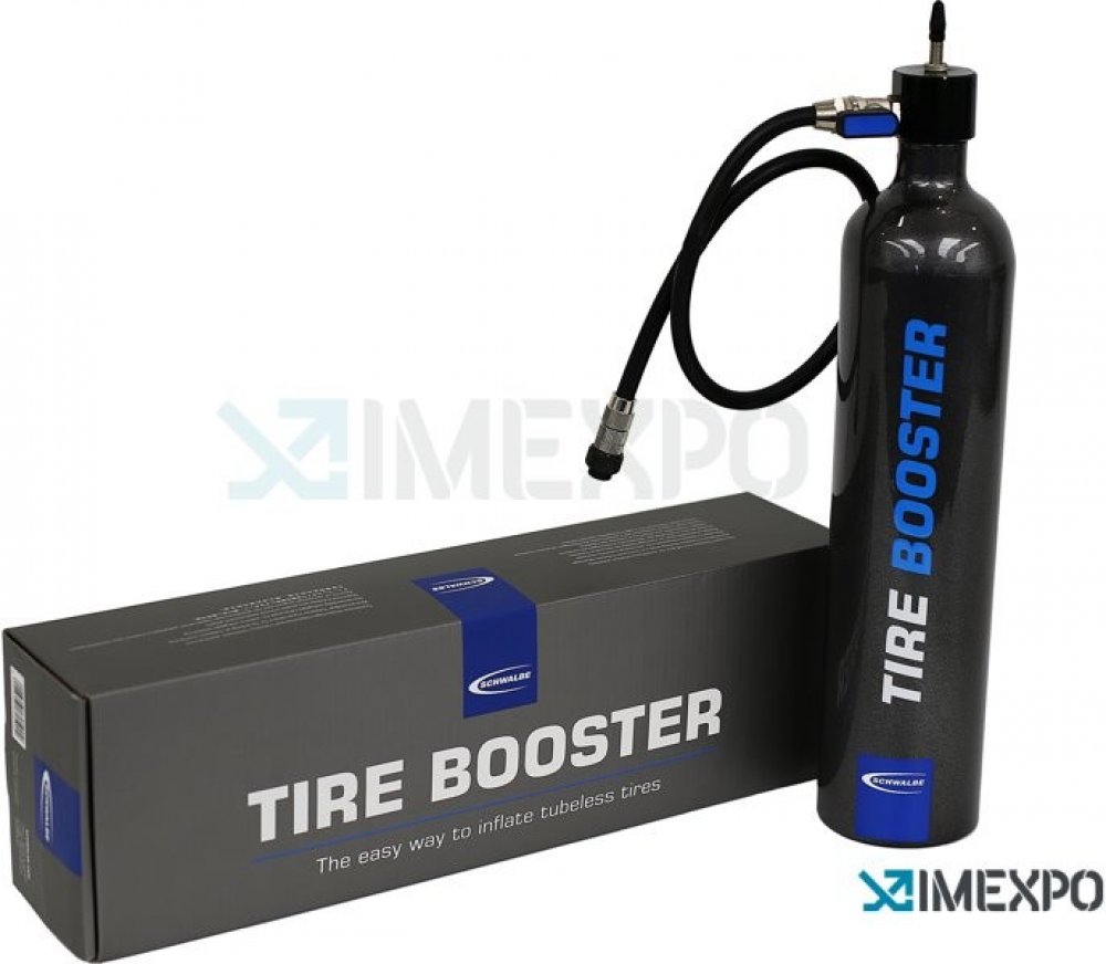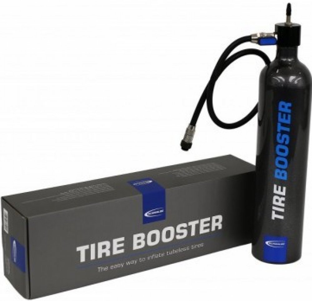 Pro jistou a jednoduchou montáž bez kompresoru přichází teď Schwalbe s Tire Boosterem, který vznikl díky spolupráci s britskou start up firmou Airshot. Díky němu lze dostat do pláště najednou tlak až 11 barů. „Tím se plášť okamžitě usadí v ráfku a je dobře utěsněn“, říká Peter Krischio. „ Tire Booster je velkou výhodou při tubeless montáži. Se svými 435ti gramy se lehce přenáší.“ Kdo potřebuje ještě vyšší tlak, může použít specielní adaptér. Po odšroubování ventilku a nasazení adaptéru je dosaženo maximálního přímého proudu vzduchu.