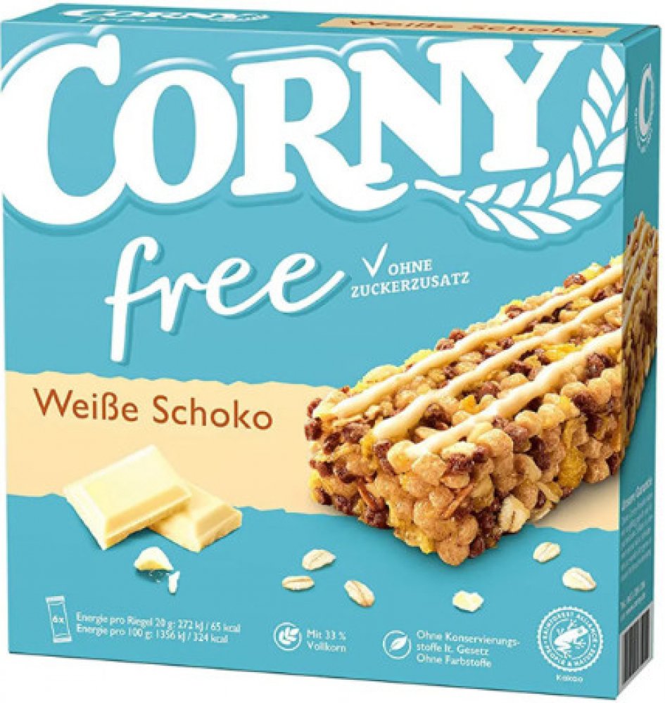 Müsli tyčinka s bílou čokoládou bez přidaného cukru 6x20g 120gCorny free bílá čokoláda je bezstarostné občerstvení. Tyto müsli tyčinky s lahodně jemnou chutí jsou vyrobeny z vydatných ječných a pšeničných vloček a obilných křupek s obsahem kakaa. Jemná bílá čokoláda zjemňuje tuto specialitu a jemně se rozpouští v ústech, zatímco pochoutku doplňují křupavé kukuřičné lupínky. SCHWARTAUER WERKE GmbH ...