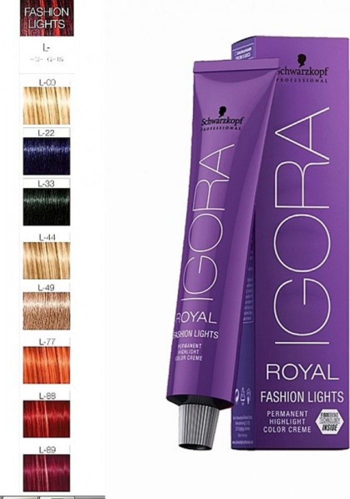 Permanentní barva na vlasy. Fashion Lights nabízí podkategorii melírovacích barev, které poskytují maximální kontrast a maximální zesvětlení pro zářivé barvy, opět pouze v jediném kroku. Zesvětluje a barví v jednom kroku. Dodává oslnivý lesk a zářivost. Zesvětluje vlasy až o 5 úrovní. Intenzivní kontrast dokonce i na tmavých nebo barevných základech. POZOR: Barva je určena pouze pro aplikaci do délek, ne přímo na pokožku! Používá se pouze na melírování vlasů v tónu 6 a tmavší. Okouzlete své okolí pravou barvou v plné kráse s novou novou érou Igora Royal, která vám splní jakékoliv přání týkající se barvení, bez ohledu na typ vlasů, váš styl či věk. Očekávejte perfektní krytí na perfektní krytí bílých vlasů a nejvyšší sytost módních odstínů. Nová Igora Royal poskytne vašim vlasům dokonale sjednocenou barvu dokonce i na porézních a poškozených vlasech. Už se nemusíte bát rychlému vyblednutí barvy. Díky pokrokovým technologiím zajistí vašim vlasům až o 50% delší zachování barvy a o 25% lepší zářivost. Použití: Míchání: Výběr správného olejového developeru: 12%/40 Vol. = moderní melírování Míchací poměr: 1:1 (např. 60ml barvy na vlasy Igora Royal + 60 ml Igora Royal Oil Developer) Speciální zesvětlení: zesvětlení o 4-5 stupňů, používá se olejový developer 12%/40 Vol. a míchací poměr 1:2 např. 30ml barvy na vlasy Igora Royal + 60 ml Igora Royal Oil Developer) Aplikace: Aplikujte na suché, nemyté vlasy. 1. Aplikace na dosud nebarvené vlasy: Nejprve aplikujte do středních délek a konečků. Po 10-15 minutách aplikujte ke kořínkům. 2. Aplikace na odrosty: Nejprve aplikujte ke kořínkům na oblast odrostů. Po 15-30 minutách pomocí duální aplikace naneste do středních délek a konečků. Doba působení: 10-30 minut = olejový developer 3%/10 Vol; 30-45 minut = ostatní olejové developery. Oplachování: Vytvořte amulzi a důkladně opláchněte. Umyjte vlasy bezsulfátovým šamponem pro barvené vlasy Color Freeze a použijte kondicionér nebo kúru. Pozor: Pro aplikaci barvy je třeba olejový developer Schwarzkopf Igora Royal Oil Developer, který prodáváme zvlášť. POZOR: Barva je určena pouze pro aplikaci do délek, ne přímo na pokožku! Používá se pouze na melírování vlasů v tónu 6 a tmavší.