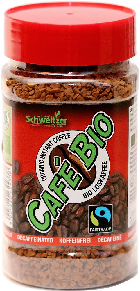 Kvalitní bio instantní káva arabika bez kofeinu z Bolívie, Mexika, Hondurasu a Peru, kde byla pěstována dle pravidel ekologického zemědělství a obchodována v rámci certifikace spravedlivého obchodu Fairtrade. Káva obsahuje maximálně 0,3 % kofeinu.