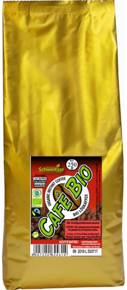 Kvalitní bio instantní káva arabika bez kofeinu z Bolívie, Mexika, Hondurasu a Peru ve větším balení v sáčku. Káva byla vypěstována dle pravidel ekologického zemědělství a obchodována dle principů spravedlivého obchodu Fairtrade International. Káva obsahuje maximálně 0,3 % kofeinu.