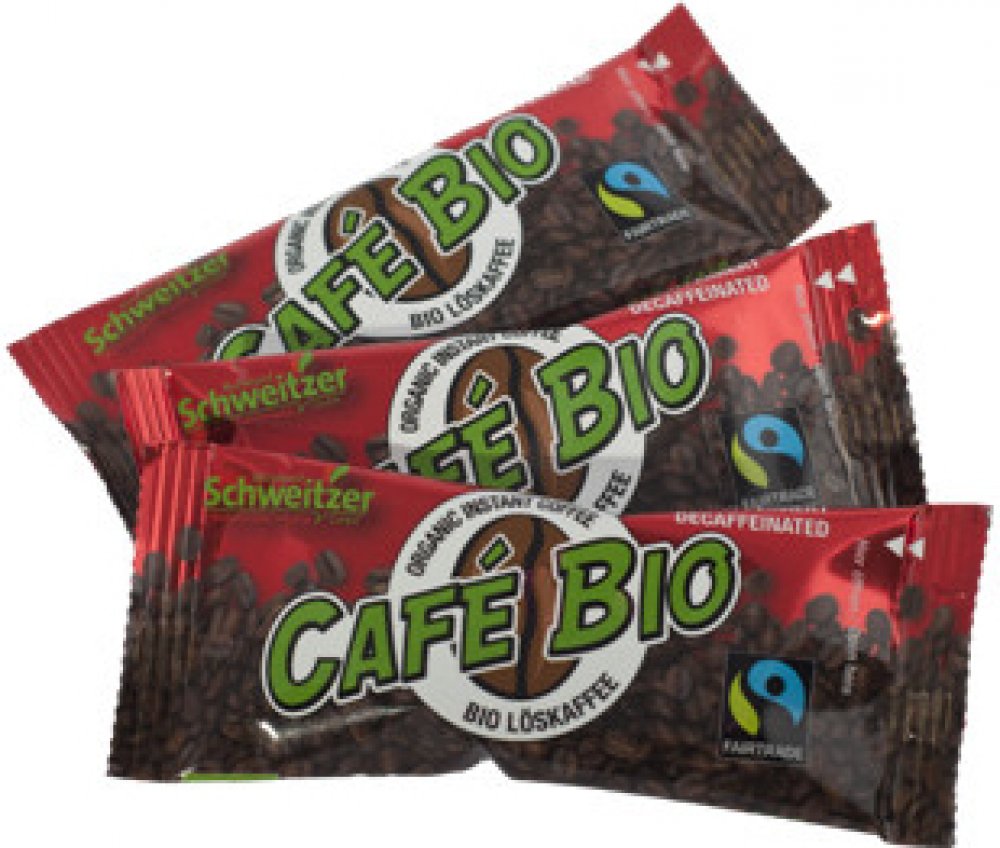 Bezkofeinová rozpustná káva.Hmotnost: 2,4 gMrazem sušená rozpustná bezkofeinová káva z ekologického zemědělství. Složení: 100% mrazem sušená zrnková káva (arabika). Podíl Fair Trade složek je 100%.