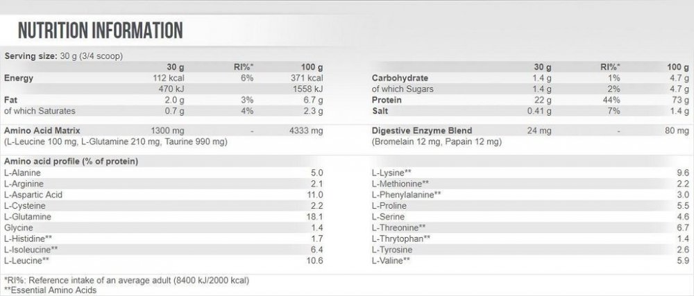 Čokoláda-lískový oříšek: Instantní syrovátkové proteiny 86 % {syrovátkový proteinový koncentrát (mléko) [Emulgátor: lecitiny (sója)], syrovátkový proteinový izolát (mléko) [emulgátor: lecitiny (sója)]}, taurin 3,3 %, kakaový prášek se sníženým obsahem tuku, L -Arginin 1,7 %, L-Glutamin 1,7 %, sůl, zahušťovadlo (xanthanová guma), sladidla (acesulfam K, sukralóza), L-leucin 0,3 %, protispékavá látka (oxid křemičitý), bromelain z ananasu 0,07 % (1200 GDU) /g), papain z papáji 0,07 % (1,5 FIP U/mg).