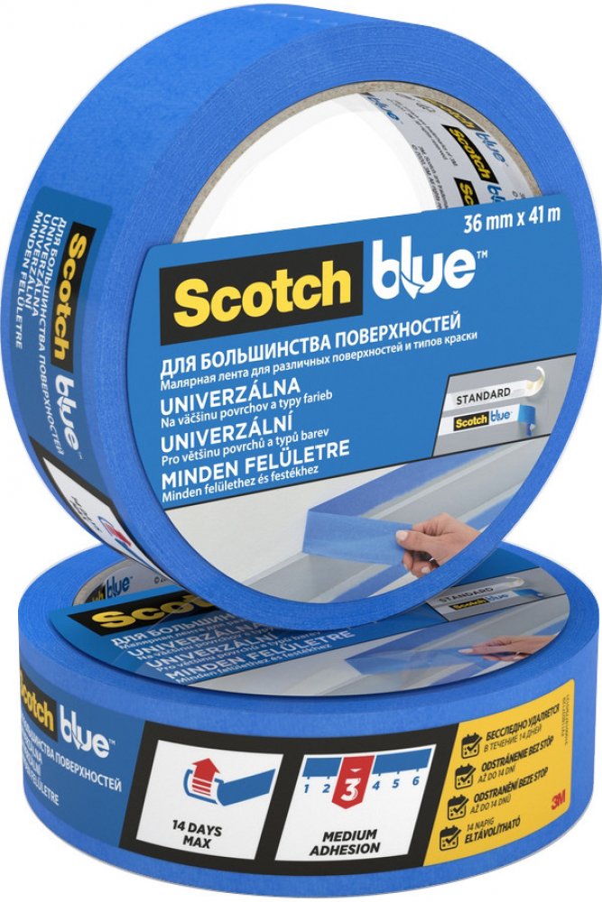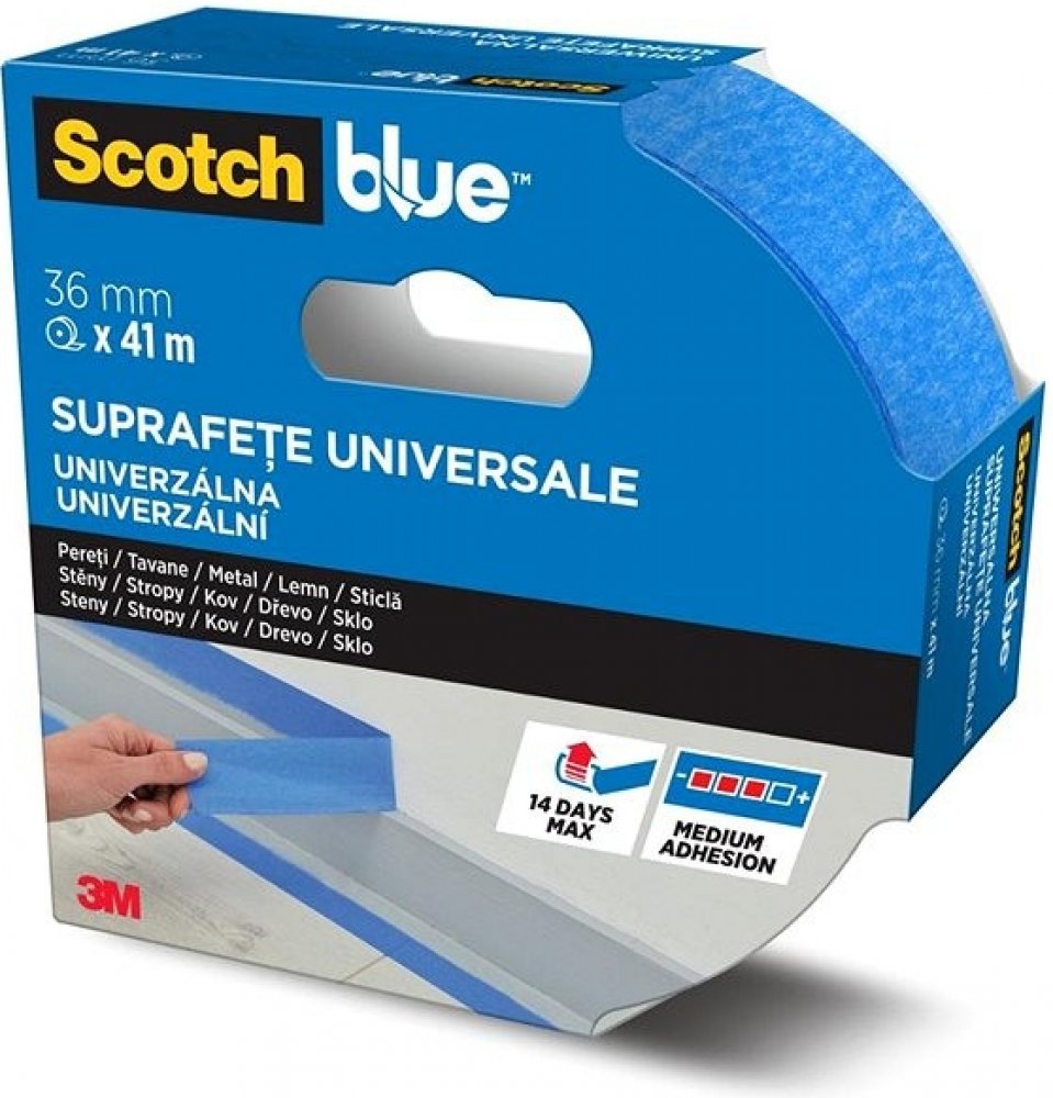 Univerzální maskovací páska 3M Scotch 2090 je vhodná na různé povrchy. Spolehlivě drží na stěnách, stropech, kovu, dřevu i sklu. V případě, že se odstraní do 14 dnů po aplikaci, nezanechává po sobě stopy. Páska vyniká středně silnou přilnavostí a je odolná vůči UV záření. Určená je pro použití v interiéru i exteriéru. Disponuje prémiovým podkladem ScotchBlue, díky němuž je přizpůsobivá a současně ji lze jednoduše utrhnout. Klíčové vlastnosti univerzální maskovací pásky 3M Scotch 36 mm × 41 m, provedení 2090Univerzální maskovací páska vhodná na různé povrchySpolehlivě drží na stěnách, stropech, kovu, dřevu i skluV případě, že se odstraní do 14 dnů po aplikaci, nezanechává po sobě stopyPáska vyniká středně silnou přilnavostí a je odolná vůči UV zářeníUrčená je pro použití v interiéru i exteriéruDisponuje prémiovým podkladem ScotchBlueVyrobená je z papíru s certifikátem PEFC, lepidlo je bez obsahu rozpouštědelZe 45 % je z obnovitelných zdrojůMaskovací páska 3M...