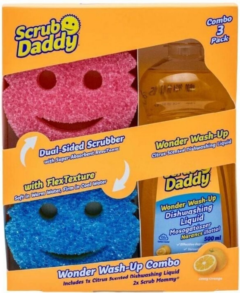 Sada na mytí nádobí Wonder Wash-Up obsahuje 1 růžovou houbičku Scrub Mommy a 1 prostředek na mytí nádobí Wonder Wash-Up – ideální na mytí nádobí! Wonder Wash-Up, první mycí prostředek na nádobí od Scrub Daddy, způsobuje revoluci v mytí nádobí! Toto vysoce výkonné, všestranné a ekonomické složení je perfektním řešením pro mytí každodenního kuchyňského náčiní - od sklenic až po hrnce a pánve. Balení: 500 ml. Osvěžující pomerančová vůně : Užijte si příjemnou pomerančovou vůni při mytí nádobí! Účinné : Snadno odstraňuje mastnotu a nečistoty! Úsporný : Na 5 litrů vody stačí pouze 3–5 ml! Houbička Scrub Mommy má stejný ergonomický design jako houbička Scrub Daddy, ale v oboustranném provedení. Jeho unikátní strana FlexTexture® mění tvrdost: měkká v teplé vodě a tvrdá ve studené vodě, což vám pomůže odstranit zaschlé zbytky jídla a nečistoty. Měkká, 6x savější strana ResoFoam® je skvělá pro pěnění a stírání uvolněných nečistot. Scrub Mommy zůstává bez zápachu po dobu 8 týdnů a je vhodná do myčky na horním mřížce!