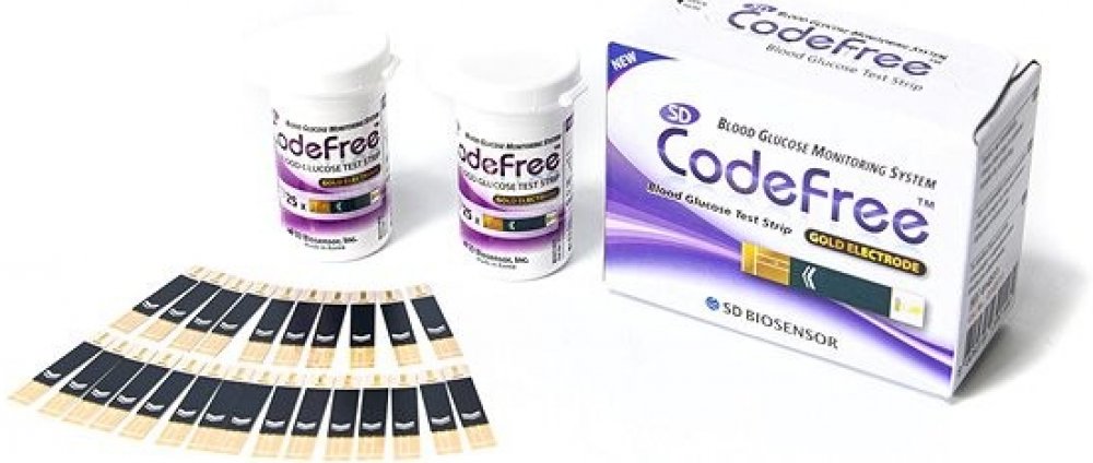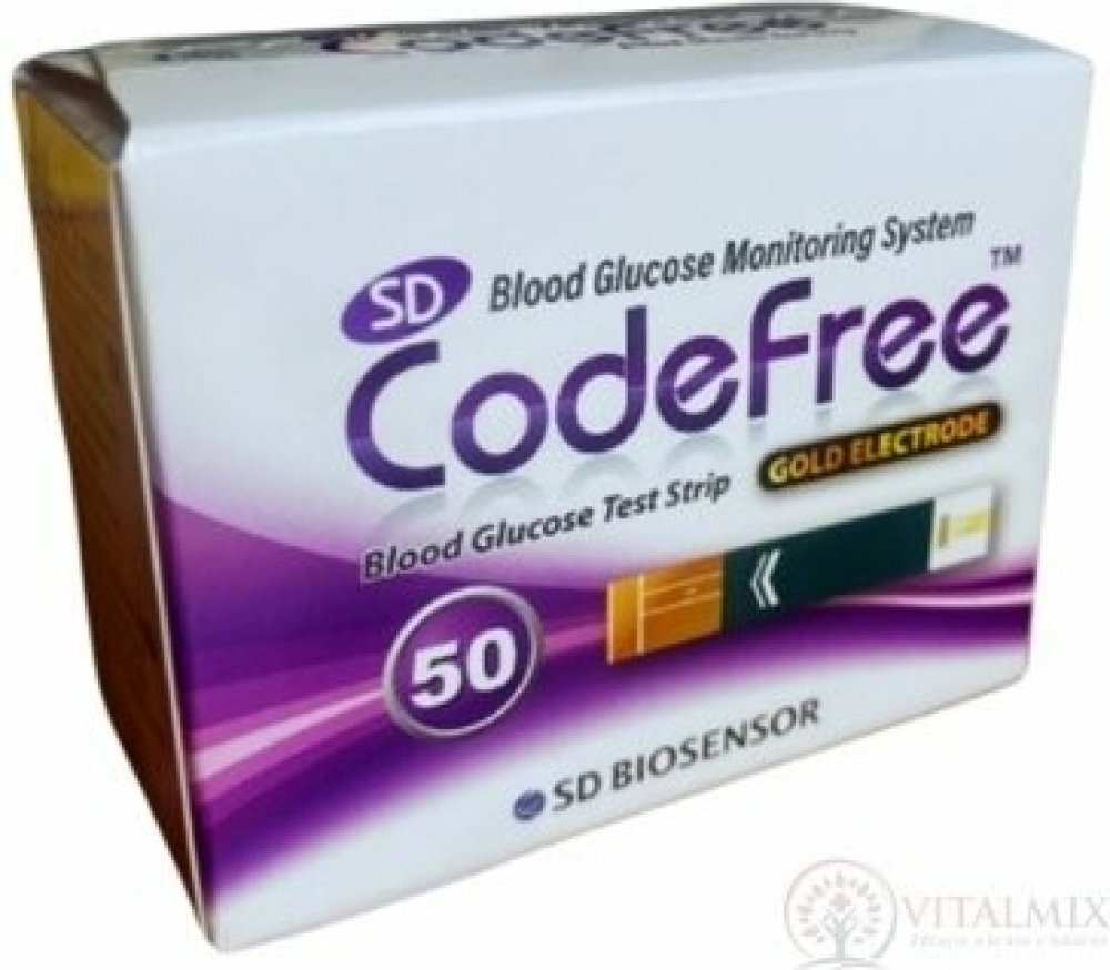 SD Codefree™ měřicí proužky jsou vybaveny elektrodou, která měří hladinu krevní glukózy. Jsou unikátní svým sanonasávacím senzorem a autokódováním glukometru - není potřeba s každým balením proužků přístroj kalibrovat.Dotykem kapky krve konce měřícího proužku se do reakční komůrky (žluté políčko s reakční látkou) automaticky nasaje krev pomocí kapilárních sil. Po naplnění reakční komůrky krví začne měřič měřit hladinu glukózy v krvi. Toto je jednoduchý a praktický systém, vhodný pro každodenní kontrolu hladiny glukózy v krvi.Proužky jsou určené pouze pro glukometry SD Codefree, které slouží pro sebetestování pracující na principu bio-chemické reakce se samonasávacím senzorem pro bezpečné a rychlé použití.Balení obsahuje 2x25 proužků.