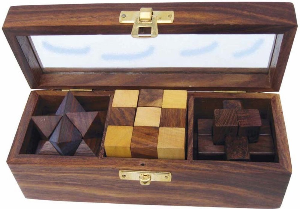 - obsahuje: dřevěný box a 3 hlavolamy