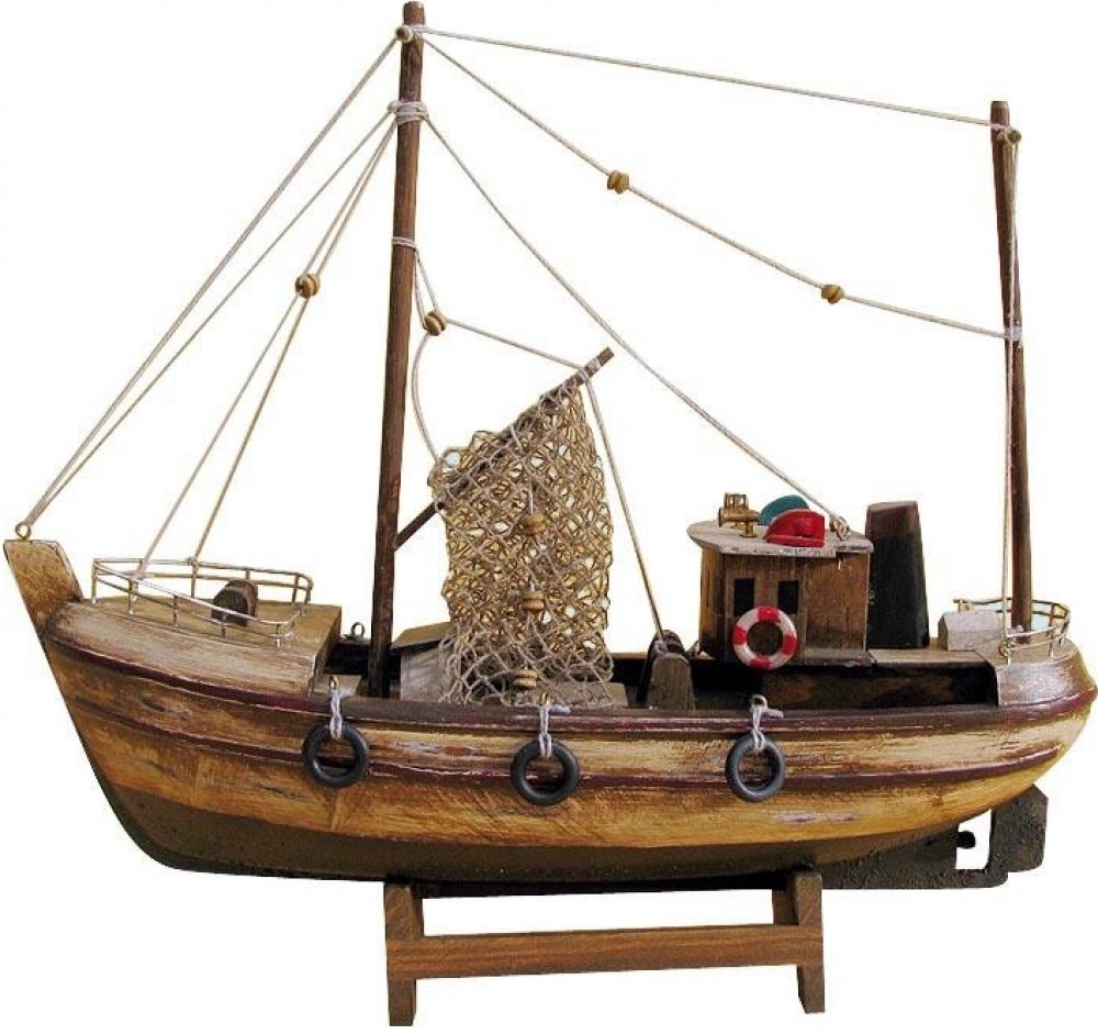 Celodřevěný model staré rybářské lodě se záchranným kruhem a rybářskou sítí o délce 30 cm a výšce 27,5 cm.Udělejte radost svému příteli, manželovi, dědečkovi a darujte mu detailně propracovaný model rybářské loďe. Materiál: dřevo, mosaz, plátno (pozn. plátno a mosazné komponety se nevyskytují u všech modelů).Délka: 30 cmVýška: 27,5 cmModel je dodáván (s ohledem na dopravu) v částečně rozloženém stavu. Jeho sestavení je velice jednoduché a zabere jen pár minut. Prakticky stačí nasunout pouze stěžně na trup. Plachty a veškeré lanoví je již sestaveno.Návod na sestavení je přiložen.