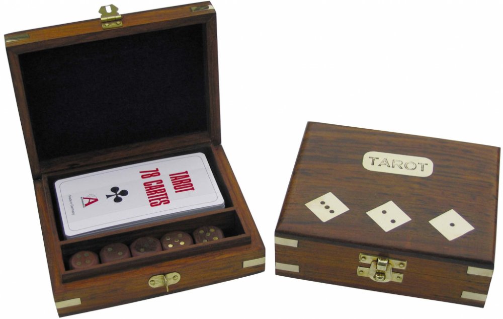 Tarotové vykládací karty a dřevěné kostky v ozdobné dřevěné krabičce.