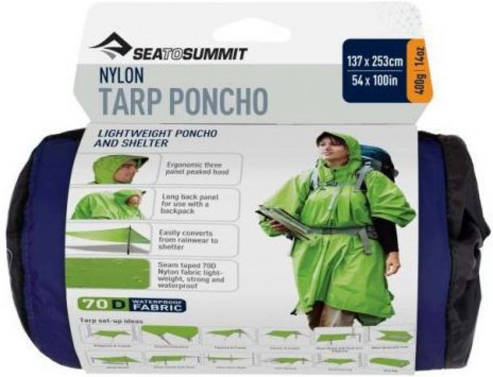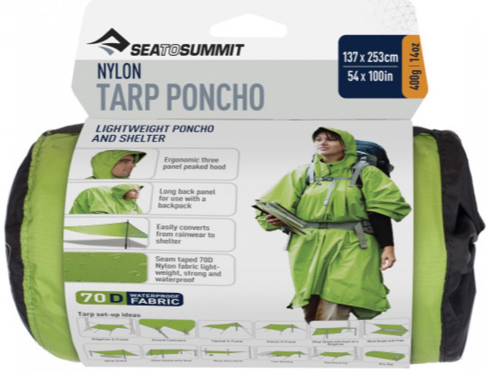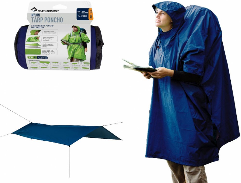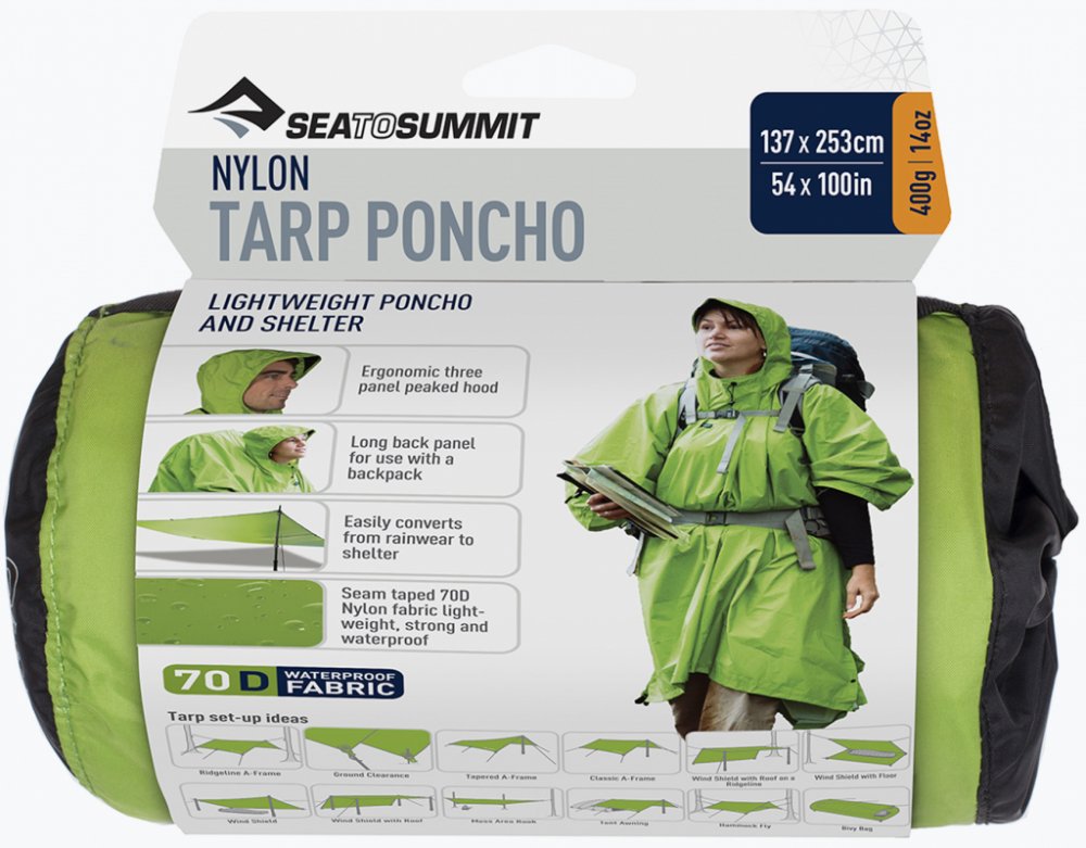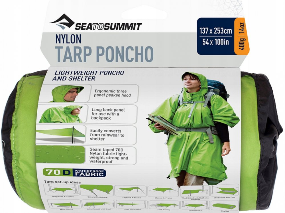 Nylonové Tarp-Poncho disponuje kapucí s lepenými švy s třípanelovou konstrukcí kapuce a širokým okrajem. Vyrobeno z lehkého a odolného 70D Nylonu s plně podlepenými švy vás udrží v suchu i v přívalovém lijáku. Když se nepoužívá jako pončo, může sloužit jako plachtový přístřešek. Dodává se úhledně složené v kapse pro jednochuché balení.