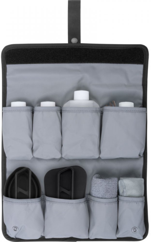 Sada obsahuje šikovný kartáček na odstranění hrubých nečistot , v kartáčku je chytře umístěna plastová lahvička s mycím prostředkem, který je biologicky odbouratelný. Dále v balení najdete další dvě uzavíratelné lahvičky o objemu 50ml a jednu lahvičku o objemu 100ml, které využijete například na olej, ocet apod.. Dále jsou zde dvě utěrky - jedna z hrubšího vlákna (hodící se přímo na mytí nádobí) a druhá z velice savého mikrovlákna (DryLite) pro vysušení. Obě utěrky jsou opatřeny drukem, pomocí kterého můžete utěrky zavěsit za obal sady a nechat je uschnout. Sada obsahuje také skládací obracečku a skládací naběračku . Obal lze pohodlně zavěsit pomocí poutek a je uzavíratelné na suchý zip.