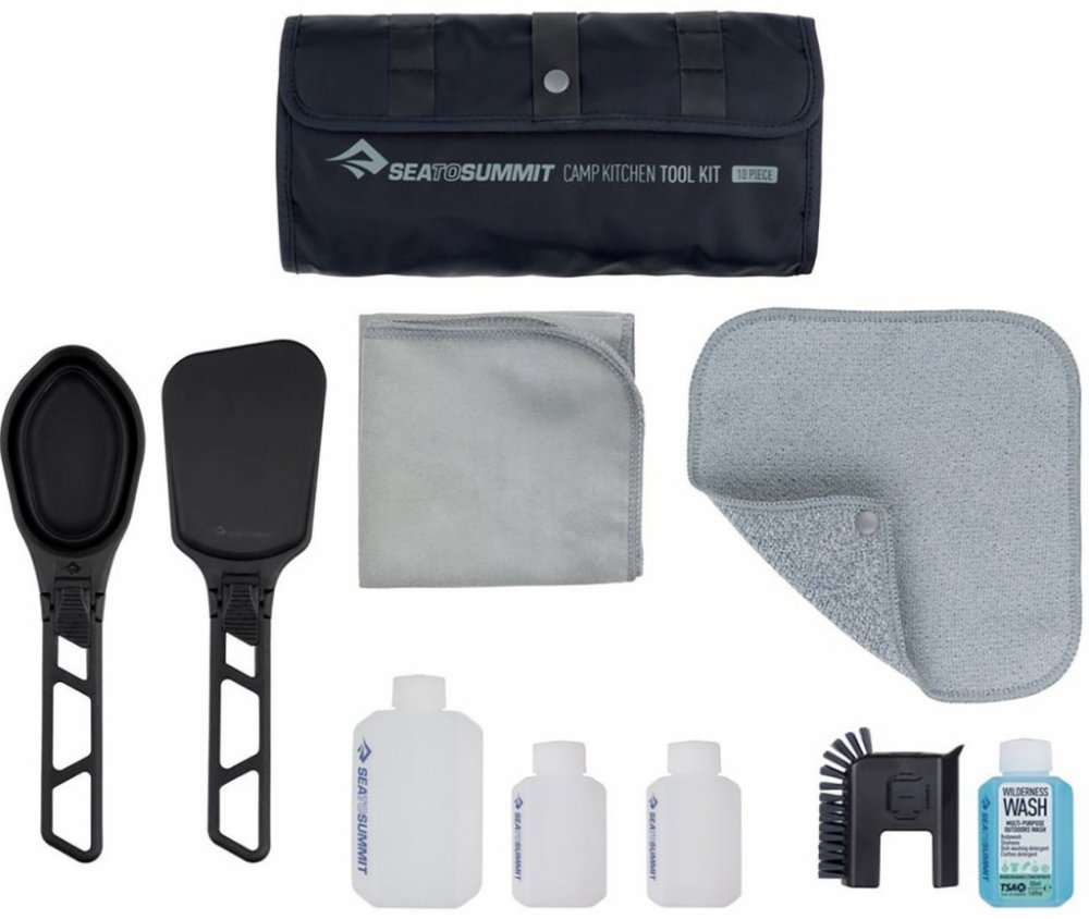 Sada nářadí do kempinkové kuchyně Sea To Summit - 10 kusů je jedinečná sada, která se skládá z potřeb pro venkovní kuchyni. Umožní vám pohodlně připravit plnohodnotné jídlo a udržovat okolí v čistotě.Sada nářadí Sea To Summit Camp Kitchen Tool Kit - 10 Piece Set vám umožní rychle a snadno servírovat uvařené jídlo pomocí lžíce a obracečky, které jsou v sadě k dispozici. Vzduchotěsné láhve vám umožní správně uchovávat a přepravovat tekuté koření. Sada vám také umožní rychle umýt a osušit nádobí po vaření a také uklidit vaši polní nebo kempinkovou kuchyni. Obrovskou výhodou sady je ochranný kryt, který zároveň slouží jako police pro všechny položky. Díky integrovanému poutku jej lze kamkoli zavěsit a přihrádky uvnitř udržují vaši venkovní kuchyni v pořádku.Sada nářadí do kempinkové kuchyně Sea To Summit - 10dílná sada - Klíčové vlastnosti:Sada obsahuje: dvě 50ml láhve, 100ml láhev, skládací špachtle, skládací lžíce, utěrka DryLite, oboustranná podložka, kartáč na drhnutí, mycí prostředek Wilderness Wash, přenosné pouzdro;Objemný kufřík na zavěšení;Uzavřené lahvičky na olej a koření o objemu 1 x 100 ml, 2 x 50 ml;Skládací špachtle z nylonu;Velká lžíce se skládací funkcí;Kartáč na mytí nádobí s mycím prostředkem Wilderness Wash;utěrka s klipy na zavěšení.