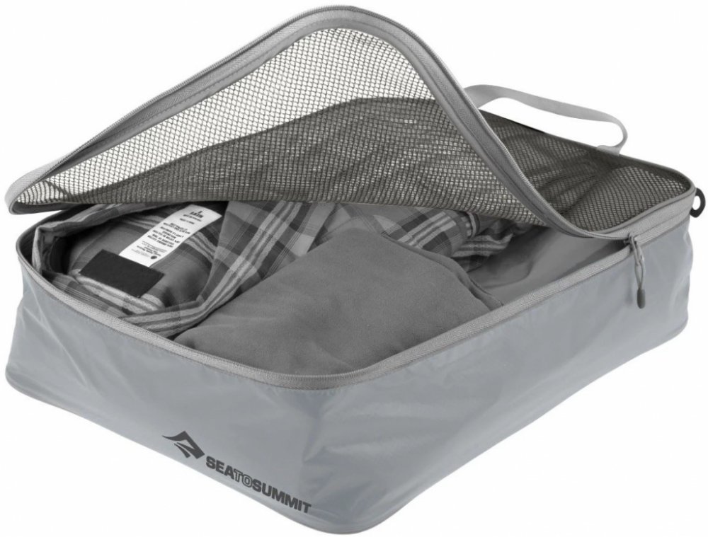 Plochý, obdélníkový profil těchto pouzder, usnadňuje úhledné, uspořádáné balení, díky kterému se vám věci nezmačkají. Obal velikosti S byl navržen pro malé položky jako je spodní prádlo, plavky, ponožky a další doplňky. Velikost M je ideální pro sbalení košil a kraťasů, zatímco velikost L pojme svetry, bundy a kalhoty.