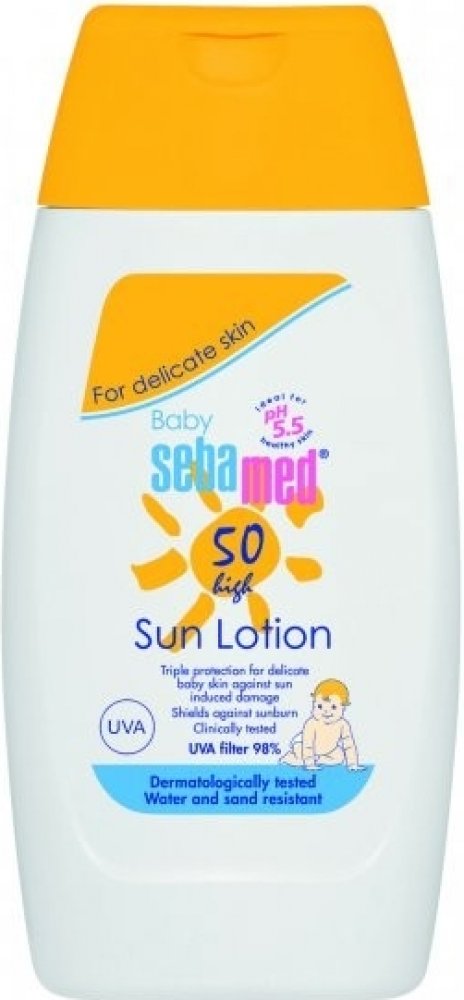 Sebamed vysoce efektivní dětské opalovací mléko s vysokým faktorem SPF 50. Prevece spálení pokožky. Odolné vodě i potu až 6 hodin. Opalovací mléko neobsahuje alkohol, barviva, paraben, parafín, sloučeniny PEG.