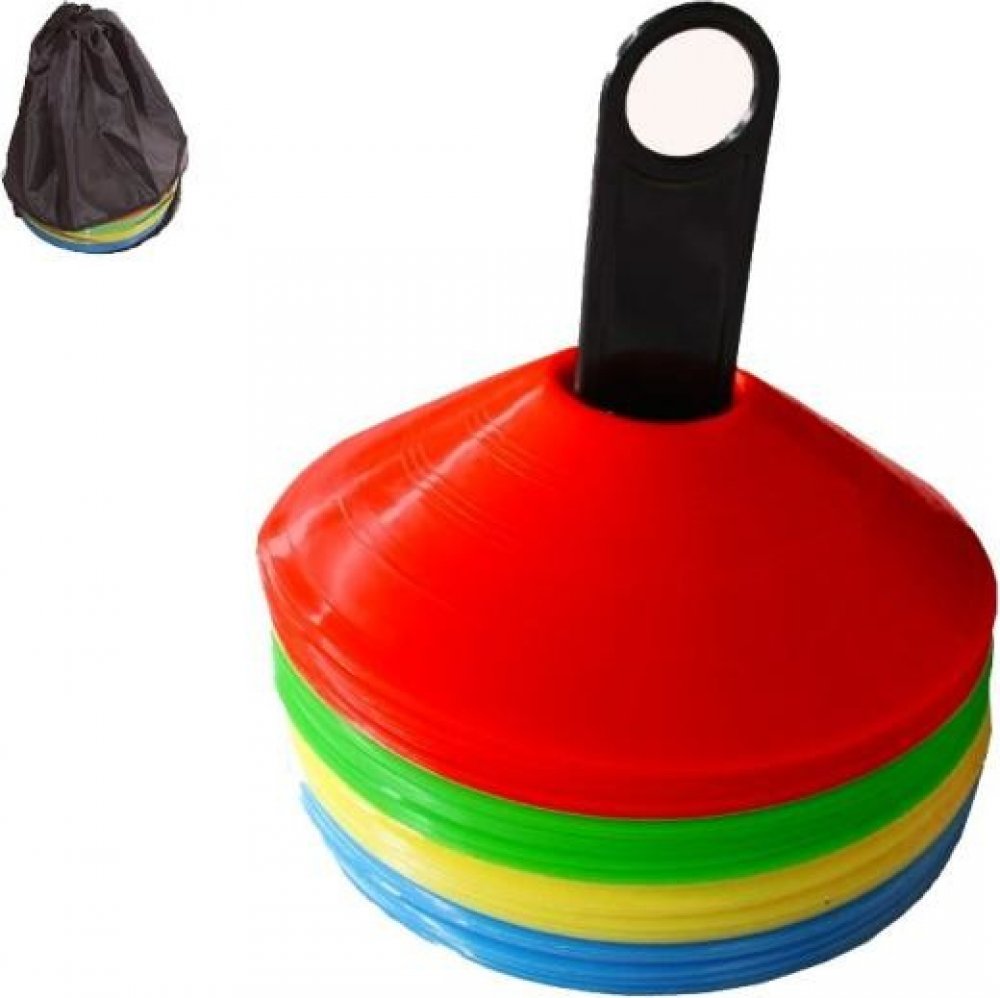 Jsou výrazně barevné kužely vyrobené z PP materiálu. Kvalitna základna o Ø20 cm. Určené pro označení terénu při na klubových trénincích na každém povrchu. Oka na špici modelu jsou určené pro uchycení gymnastických tyčí a vytváření mini překážek. Tato pomůcka je nezbytná pro každý venkovní nebo halový trénink. Součástí je také rozkládatelná základna/stojan pro snadné uschování kuželů/met. Celá sada...