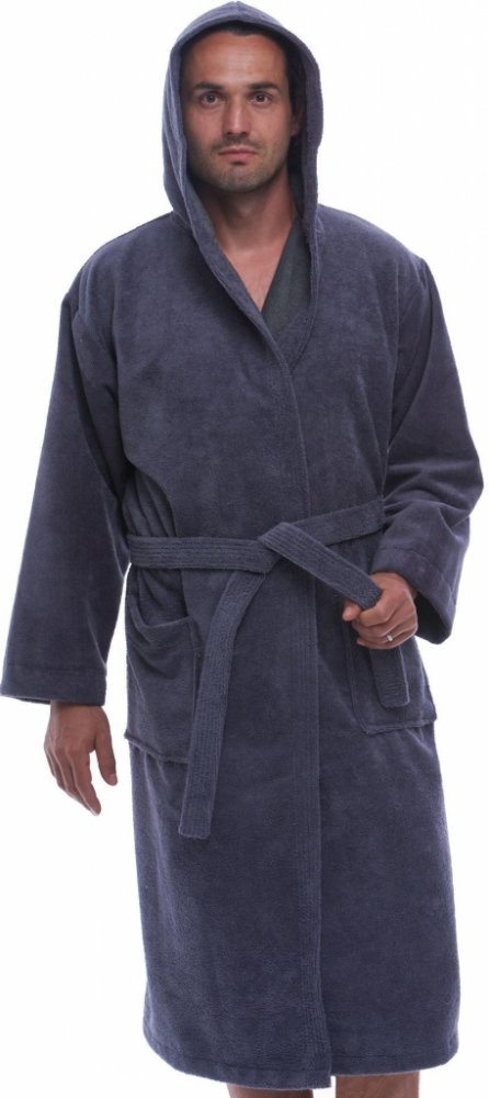 Šedomodrý pánský froté župan s kapucí šedá