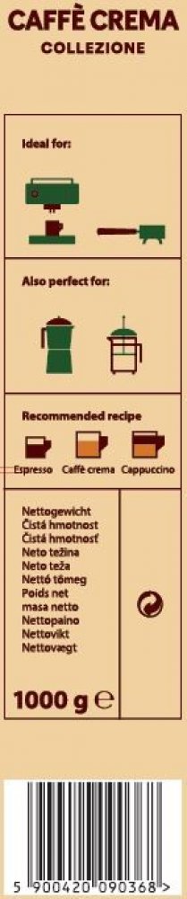 Segafredo Caffe Crema Collezion má jedinečnou, bohatou chuť se střední intenzitou. V kávě naleznete tóny tmavé čokolády, sladu a lískových oříšků. Caffe Crema Collezione se doporučuje jak pro mléčné kávy jako cappuccino nebo latte, tak pro černé kávy.
