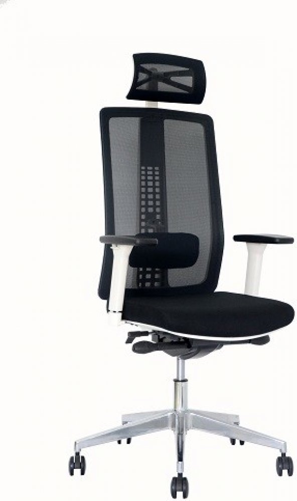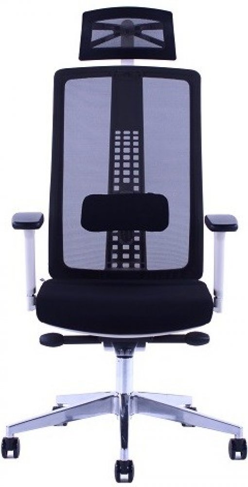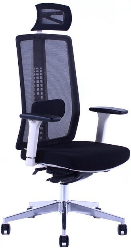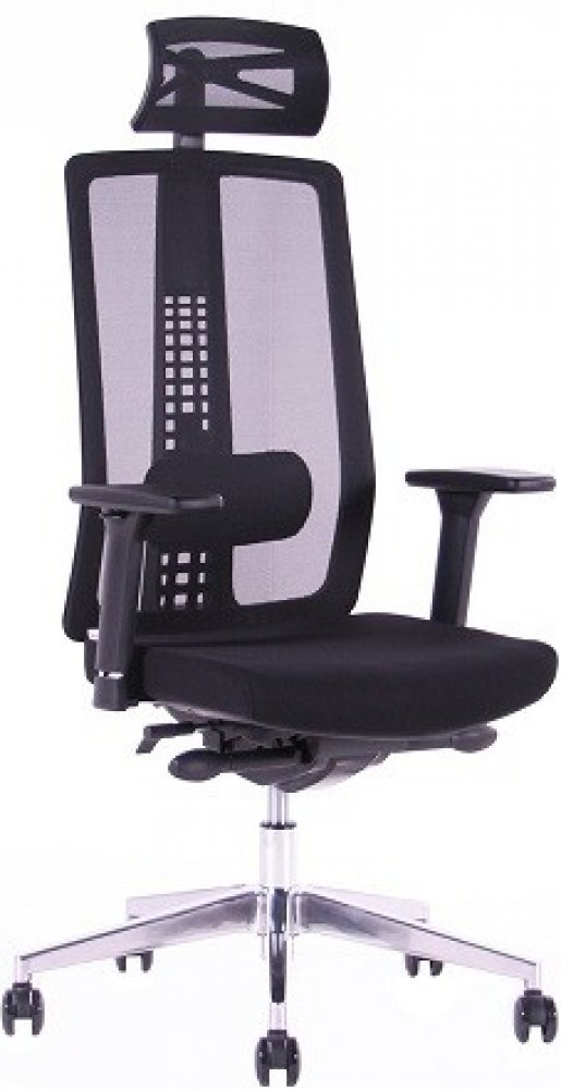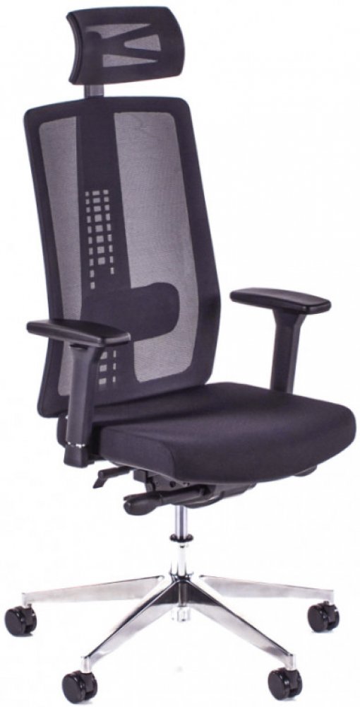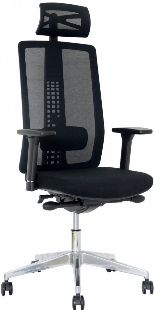 Tato pracovní kancelářská židle má prodyšný síťovaný opěrák, opěrku hlavy a sedák čalouněný do černé elastické látky.