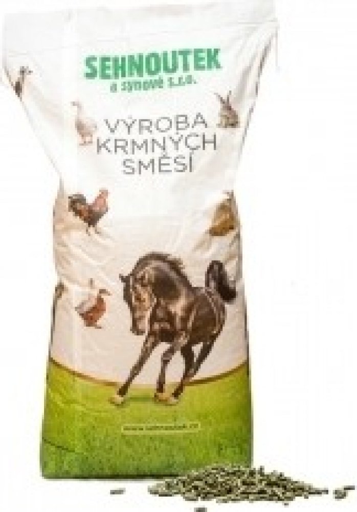 Úsušky píce vojtěšky, pšeničné otruby, slunečnicový extrahovaný šrot, oves, ječmen, jablečné výlisky sušené, cukrovarské řízky, řepkový extrahovaný šrot, uhličitan vápenatý, chlorid sodný, oxid hořečnatý,
