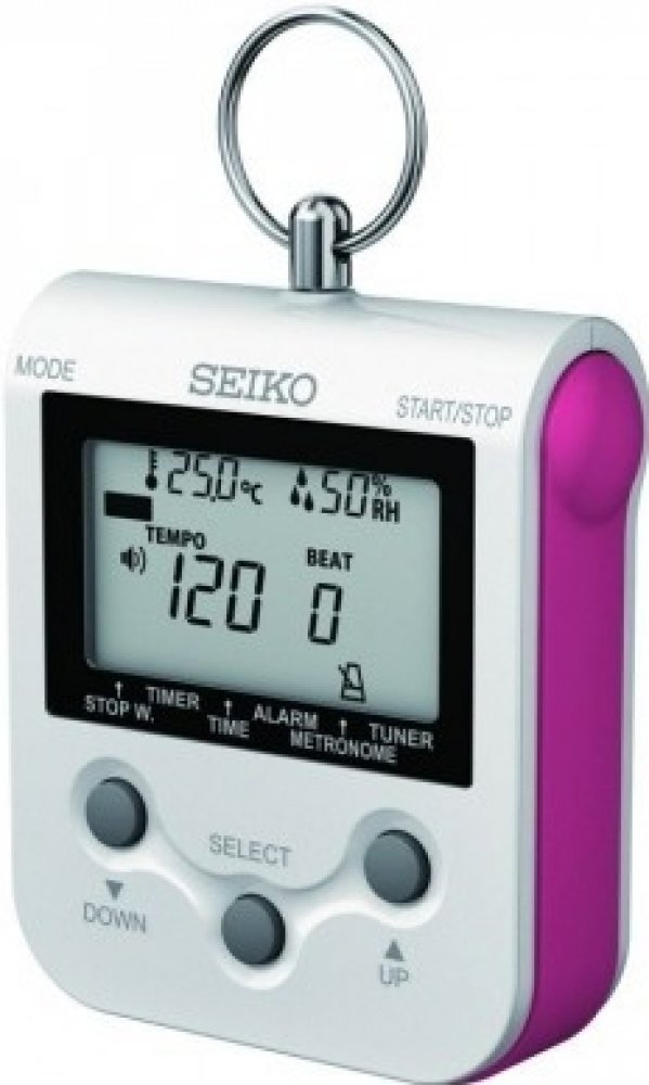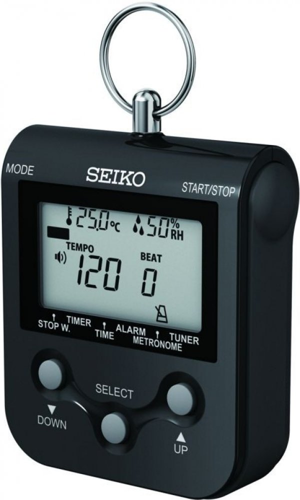 Metronom s vlhkoměrem Seiko DM90, černý. Metronom s vlhkoměrem od firmy Seiko. Má LCD displej, rozsah tempa 30–250× za minutu (221 kroků), referenční tón C4–B4 (A4 = 410–440 Hz), výstup pro sluchátka (pro jack 3,5 mm), tempo se zvukovou signalizací, 9 možností zvukového zvýraznění doby v taktu, 3 varianty rytmického členění, hodiny s alarmem, teploměr, vlhkoměr pro sledování vlhkosti uskladněných akustických nástrojů. Barva černá.