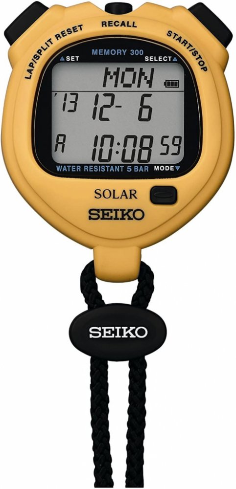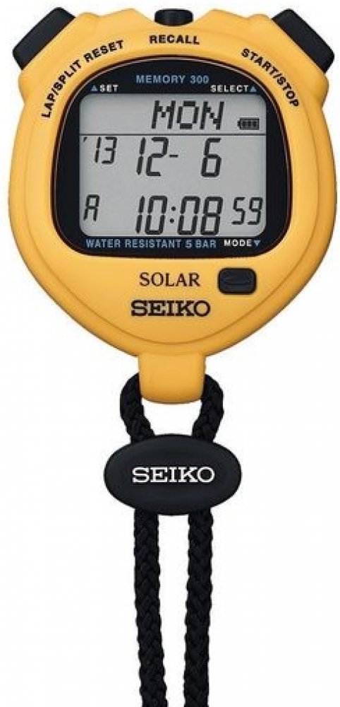 Profesionální žluté ergonomické stopky s vysokou přesností a spolehlivostí vhodné pro intervalový trénink, vytrvalostní sporty, závody, rychlobruslení, plavání a mnoho dalších sportů, kde je je důležité změřit naprosto přesně určitý časový úsek. Předností těhto stopek je solární napájení s indikátorem nabití a voděodolnost 50 m. Stopky jsou vybaveny následujícími funkcemi: paměť na 300 mezičasů, odpočet, plně automatický kalendář, přesnost měření 1/100 s po dobu 100 h, funkce Powersleep.