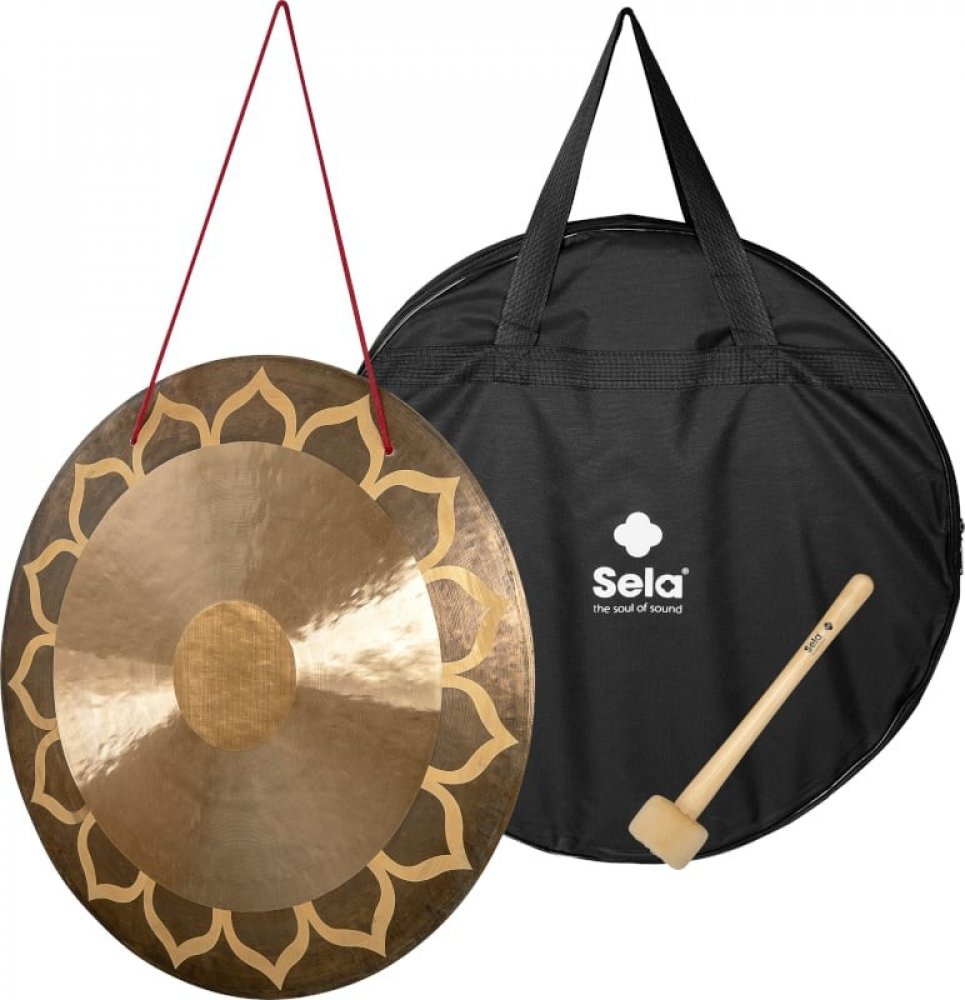 Sela Wind Gongs jsou skutečná mistrovská díla, ručně vyrobená v Číně ze speciální bronzové slitiny. Dostupné jsou ve velikostech 20, 24, 28, 32 a 36 palců. Čím větší model, tím hlubší a také objemnější zvuk má při úderu. Součástí dodávky každého modelu je palička z javoru s plastovou hlavicí se sametovým potahem a taška na přenášení na zip.Sela Wind Gong Lotus má téměř plochý tvar s vnějším okrajem, který není zakřivený dozadu. Jeho povrch je na vnějším okraji, uprostřed a v oblasti mezi nimi v různé míře upraven a zkroucen, což samo o sobě poskytuje velmi zvláštní, charakteristický vzhled s částečně třpytivým, matně-zlatým povrchem. Sela Wind Gong Lotus však vyniká zejména elegantním motivem lotosu, který je zapracován do vnější plochy. Lotosový květ je znám také jako „květ života“ a má mnoho duchovních významů – mimo jiné znamená čistotu srdce, kreativitu, moudrost a osvícení.Gongy jsou nedílnou součástí mnoha kultur po celém světě a vytvářejí uklidňující, dlouhotrvající, esoterické zvuky. V závislosti na tom, jak tvrdě, kde a čím se na Sela Wind Gong udeří, vystupují do popředí různé frekvenční rozsahy. Dá se na něm hrát mnohem všestrannějším způsobem, než by se na první pohled mohlo zdát.Pro svůj relaxační účinek se gongy mimo jiné využívají při meditaci a zvukové terapii, neboť jejich vibrace pronikají do celého těla. Perkusionisté rádi používají gong jako speciální efekt v hudebním a orchestrálním kontextu.Ručně vyrobeno v ČíněMateriál: speciální slitina bronzuDuchovní lotosový designPrůměr: cca. 60 cm (24 palců)Hmotnost gongu: cca. 6 kgPalička s javorovou rukojetí a hlavou se sametovým potahemHmotnost paličky: 170 gVčetně černé přenosné tašky