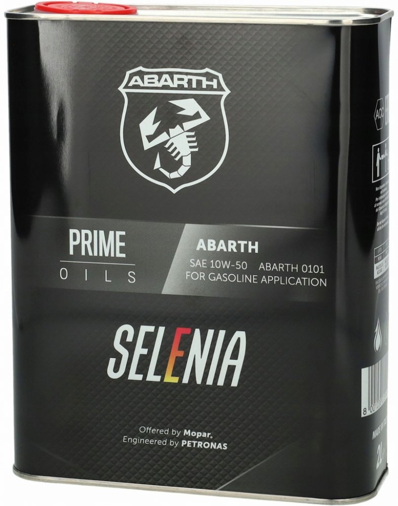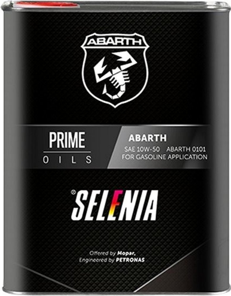 Selenia Abarth je plně syntetický olej pro motory nejvyšších výkonů a zatížení. Selenia Abarth 10W- 50 je olej formulovaný pro všechny vozy Abarth vybavené Tuning Kitem pro vyšší výkon motoru. Selenia Abarth 10w-50 zajišťuje nejvyšší možné požadavky na ochranu a výkon motoru. Zajišťuje velmi vysokou stabilitu ve vysokých teplotách. Předchází znečištění turba a optimalizuje výkon motoru. Vysoká stabilita proti oxidaci. Maximální tloušťka mazacího filmu.