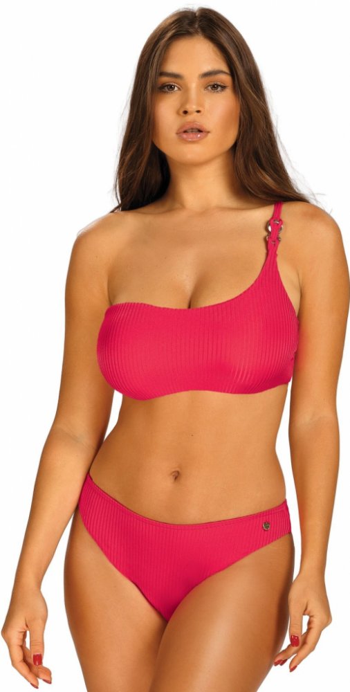 Skvostné stylovky v dvoudílném provedení určené všem milovnicím netradičních a módně vyčnívajících plavek.Plavkám dominuje atraktivní žebrovaný materiál a jedno ramínko podprsenky, které lze regulovat i odepnout v zadní části. Jeho přední stranu zdobí elegantní kovový komponent. Podprsenka je nevyztužená s odnímatelnou výztuhou. Pevnou oporu prsům dodají kostice lemující košíčky. Zapínání řešenou klasickou sponou na zádech.Do kompletu jsou klasicky střižené kalhotky s drobným kovovým přívěskem na straně.Atraktivní model dvoudílných plavek v různých barevných variantách. Vyberte si tu, která přesně vyjádří vaši individualitu.