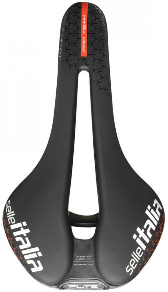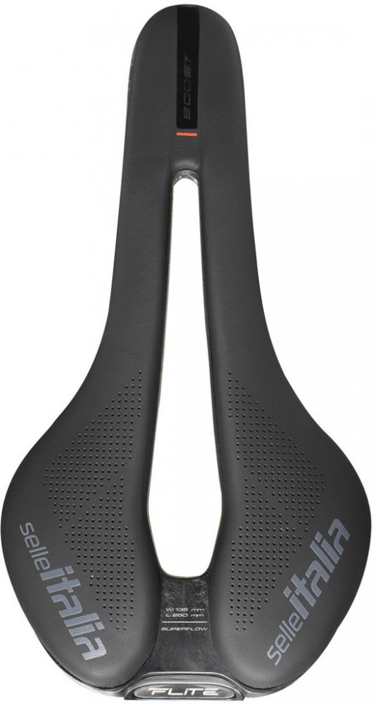 Sedlo Selle Italia Flite Boost Kit Carbon Superflow, kde typ Flite Boost pokračuje v klasickém „plochém“ tvaru, které vždy odlišuje rodinu Flite, a společně s kompaktnějším tvarem (délka 250 mm) zaručuje obvyklý výkon a maximální stabilitu při šlapání. Střední otvor sedla Superflow
