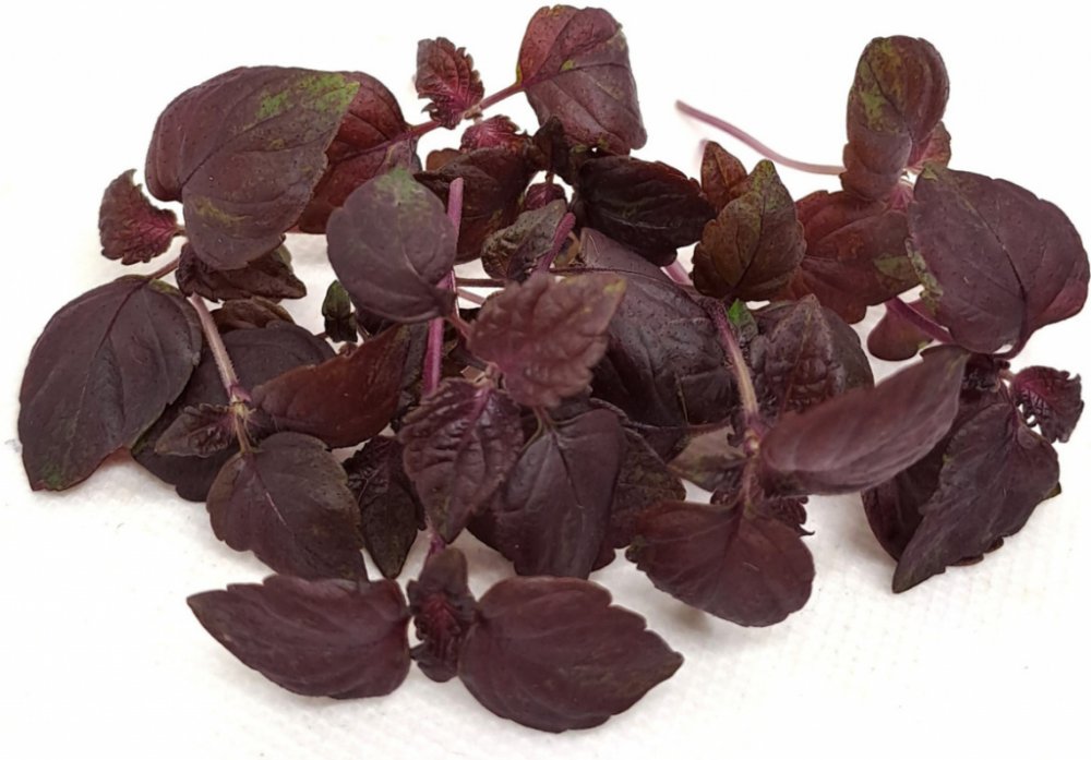 Semínka microgreens Perilla Red Shiso. Bylina sytě červenofialové barvy široce používána v japonské, korejské a jihovýchodní asijské kuchyni.