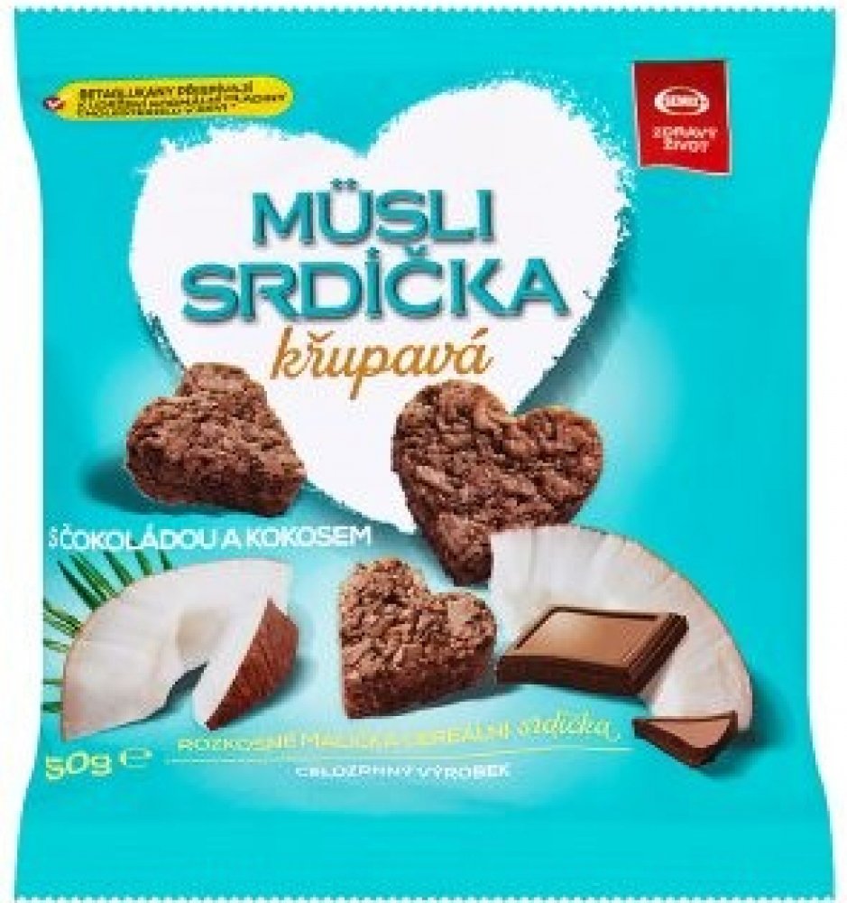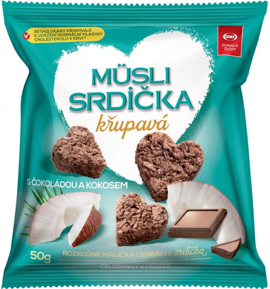 Rozkošně maličká cereální srdíčka s betaglukany. Müsli srdíčka pro vás vyrábíme unikátní technologií výroby. Jsou vhodné jako svačinka pro dospělé i děti. Mají vysoký obsah přirozené vlákniny (4 g v porci 50 g) a obsahují betaglukany, které přispívají k udržení normální hladiny cholesterolu v krvi. Pro dosažení požadovaného účinku je nutno přijmout 3 g betaglukanů denně. Nezapomínejte dodržovat základy zdravého životního stylu a konzumovat zdravou vyváženou stravu. Výrobek obsahuje 1,1 g betaglukanů v porci (50 g).