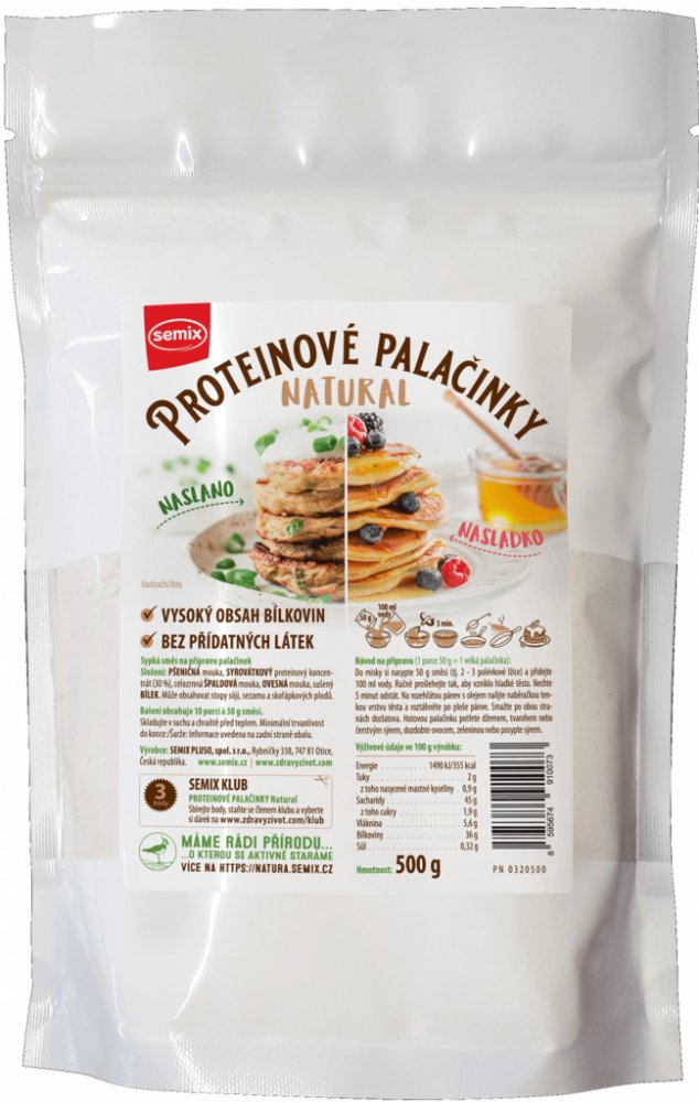 Semix Proteinové palačinky 500 g. Proteinové palačinky natural mají vysoký obsah bílkovin a jsou bez přidaných látek. Jsou chutné naslano i nasladko. Složení: Pšeničná mouka, syrovátkový proteinový koncentrát 30 %, celozrnná špaldová mouka, ovesná mouka, sušený bílek. Může obsahovat stopy sóji, sezamu a skořápkových plodů.